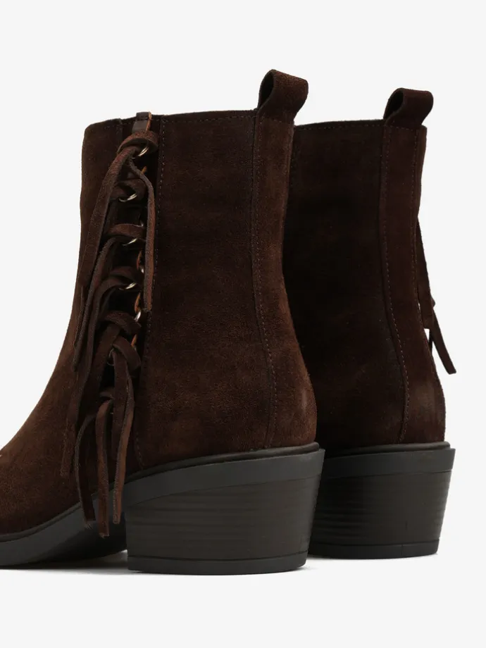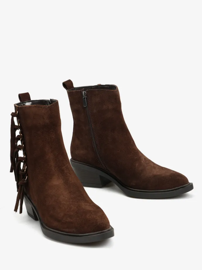 Kowbojki z ozdobnymi frędzlami i zapięciem na suwak przy kostce.