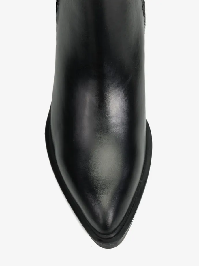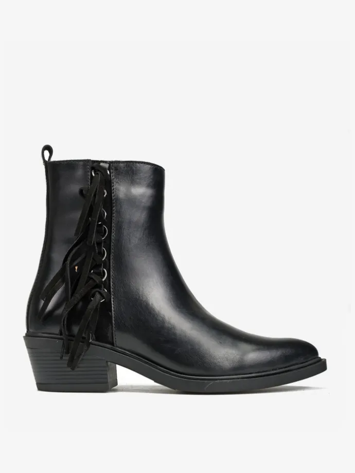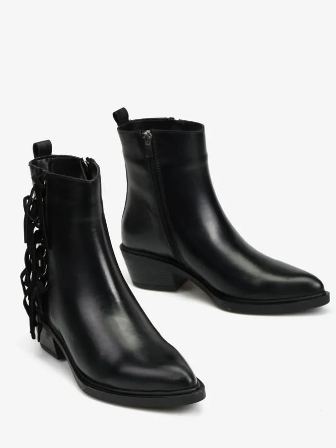 Kowbojki z ozdobnymi frędzlami i zapięciem na suwak przy kostce.