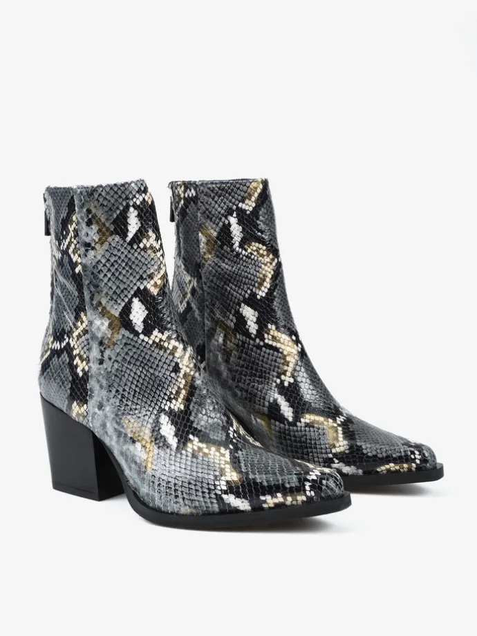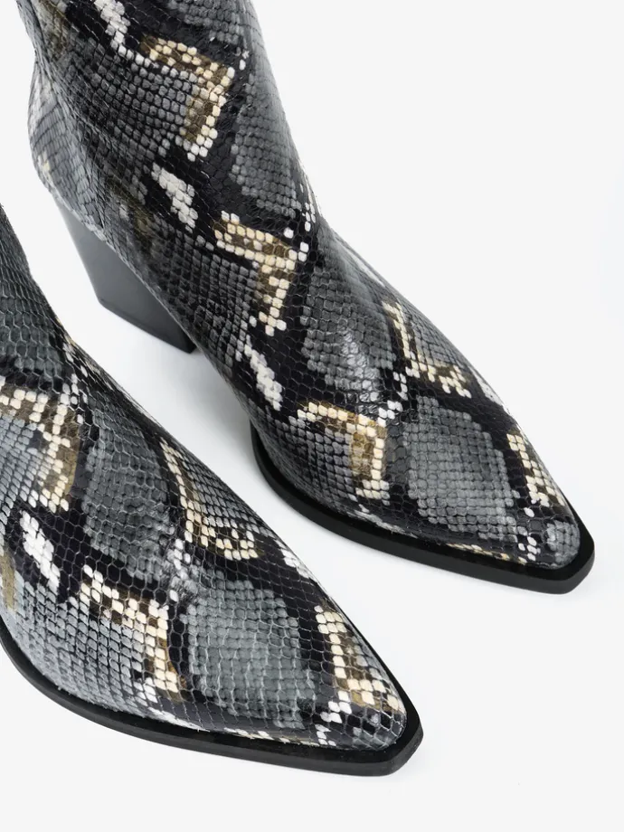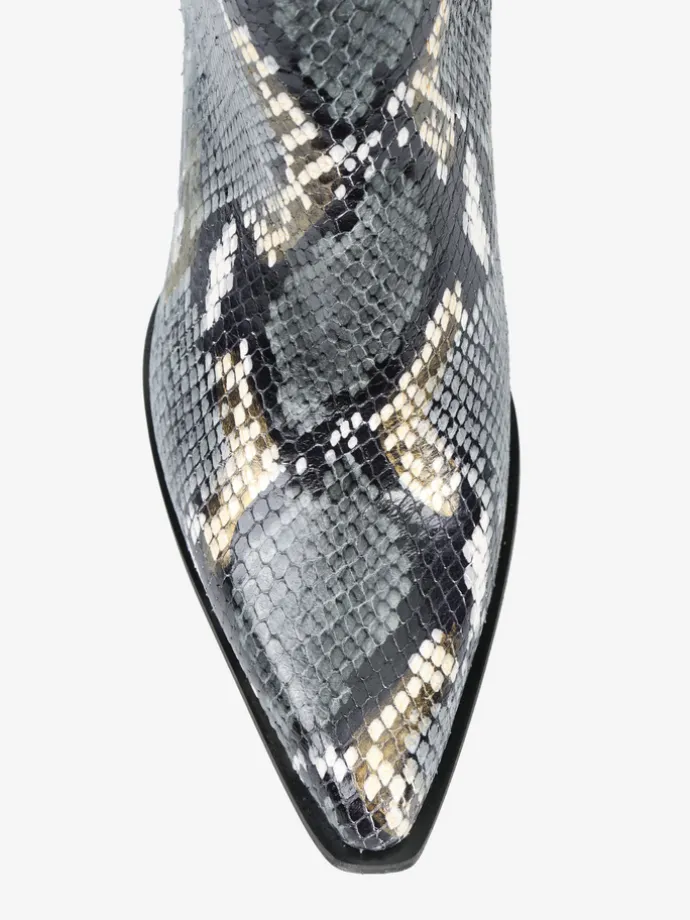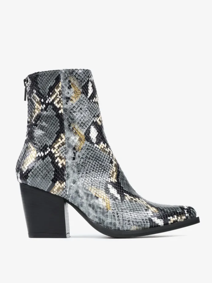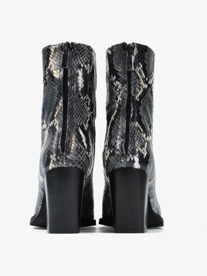 Kowbojki na wysokim obcasie z zapięciem na suwak. Wykonane z naturalnej skóry w wężowy wzór.