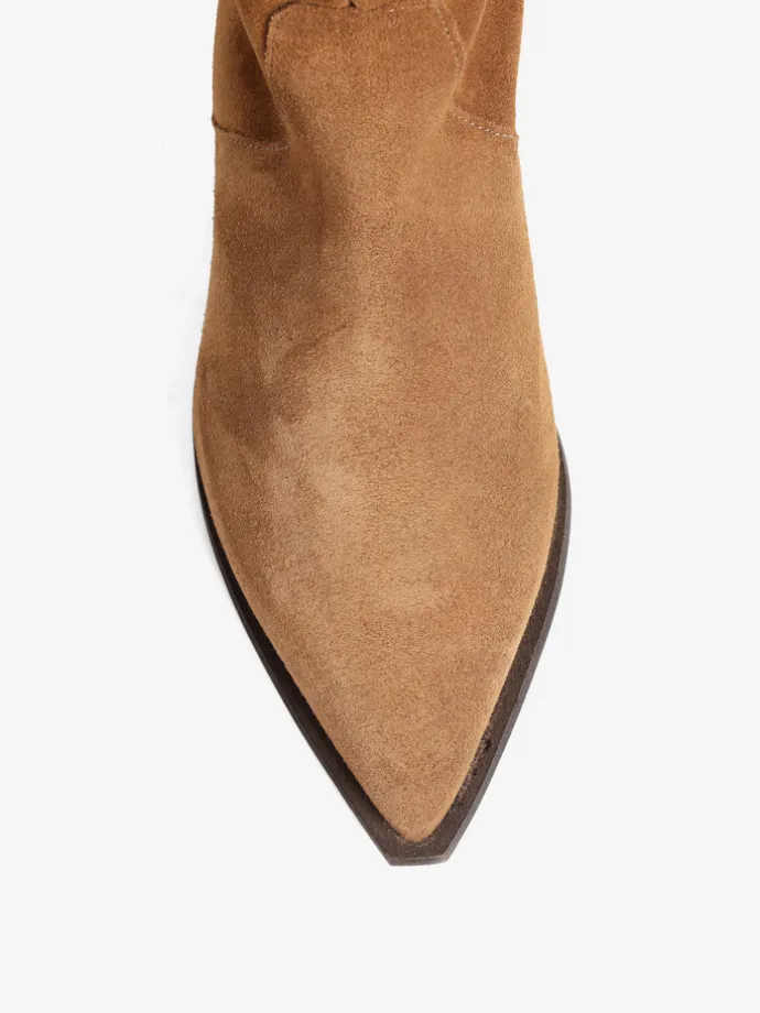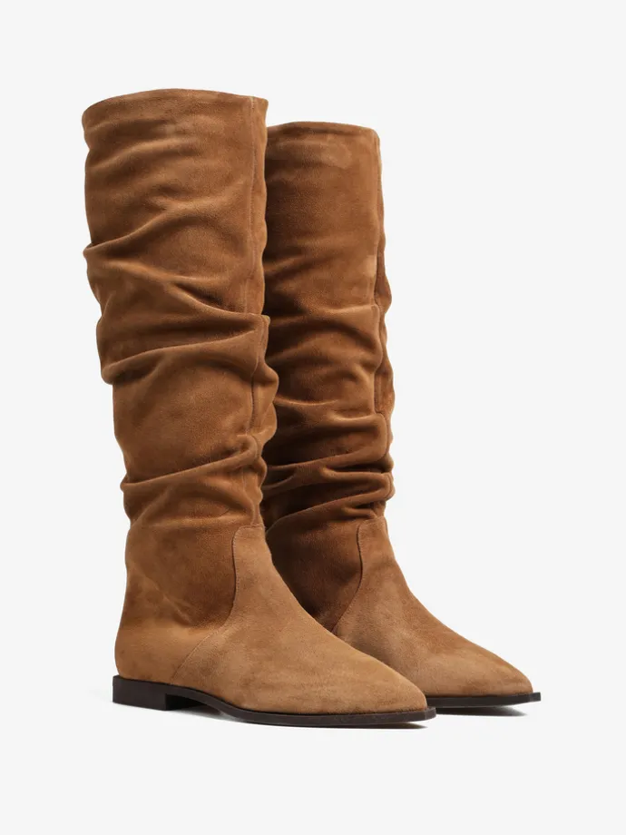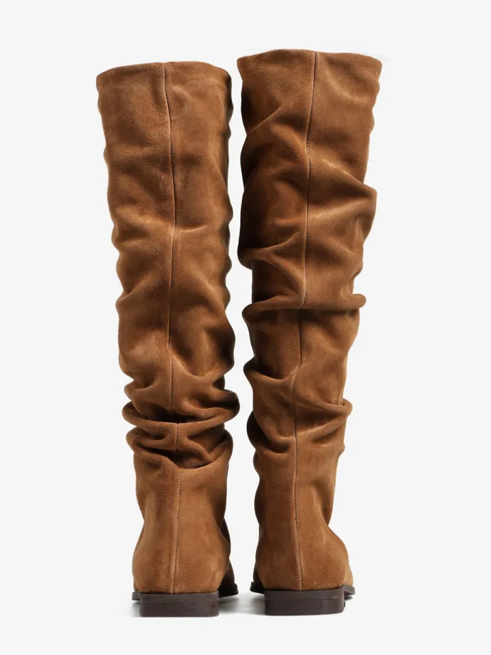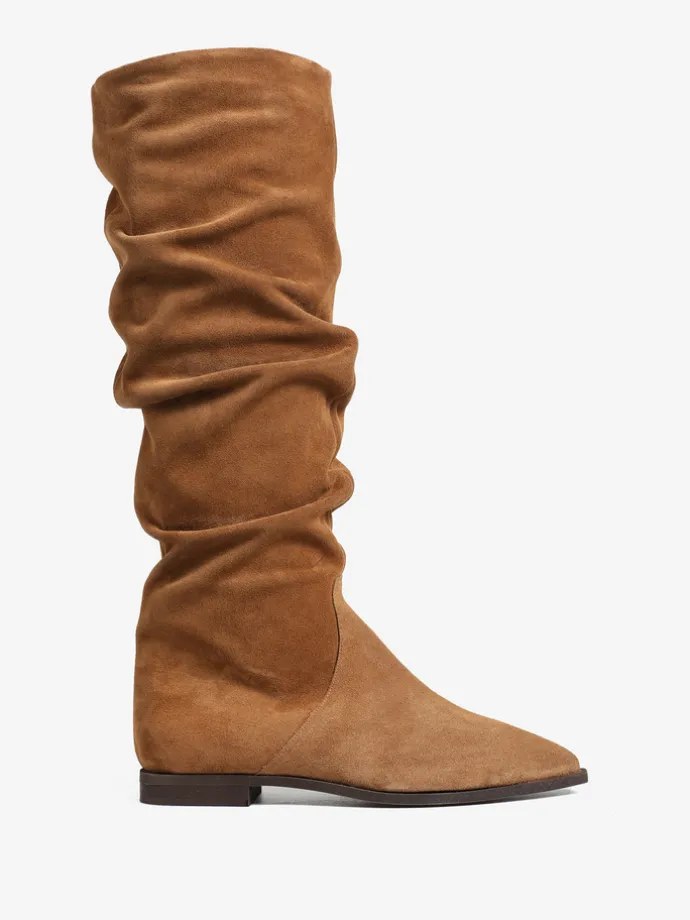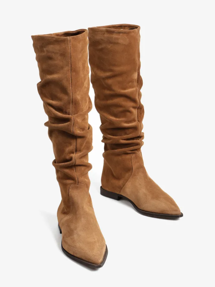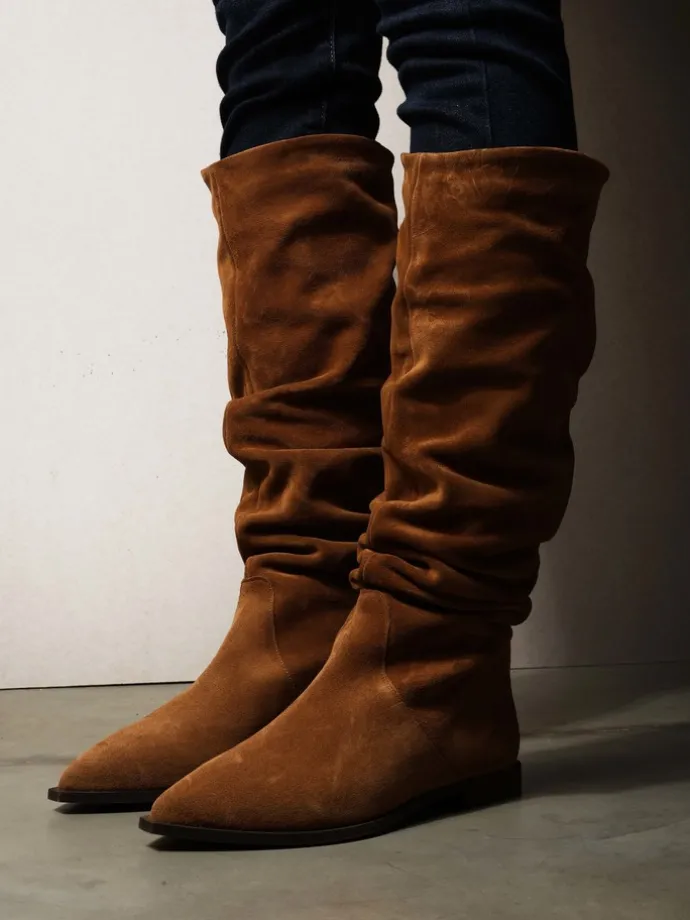 Zamszowe, wsuwane kozaki z noskami w szpic i marszczonymi cholewkami.