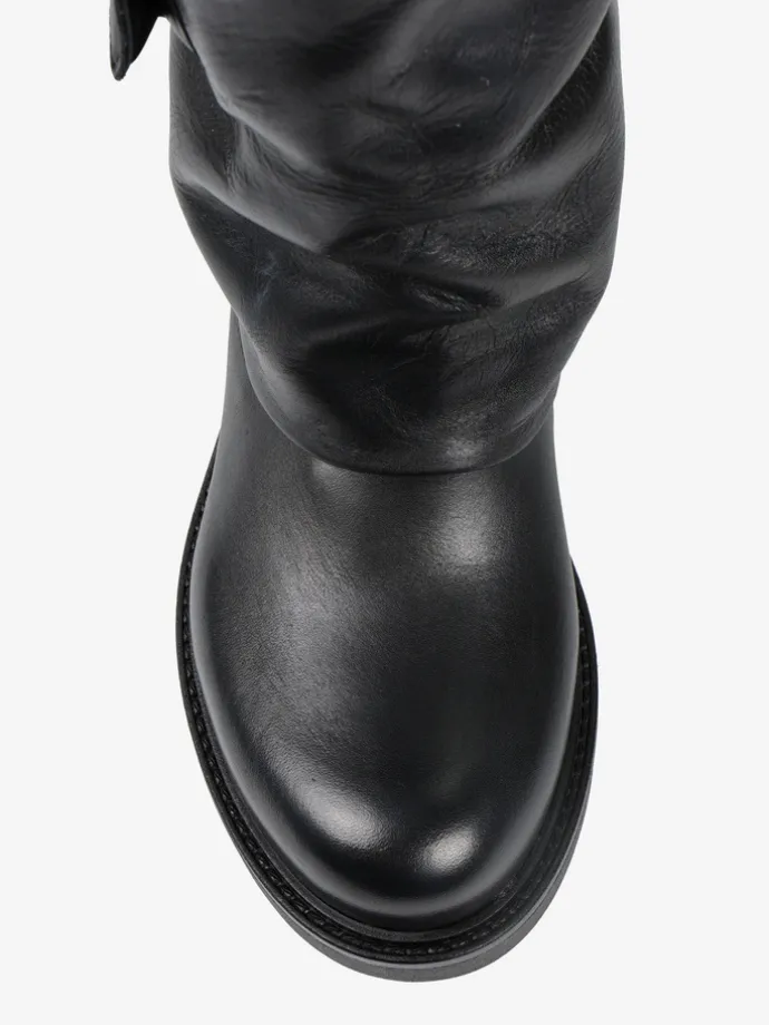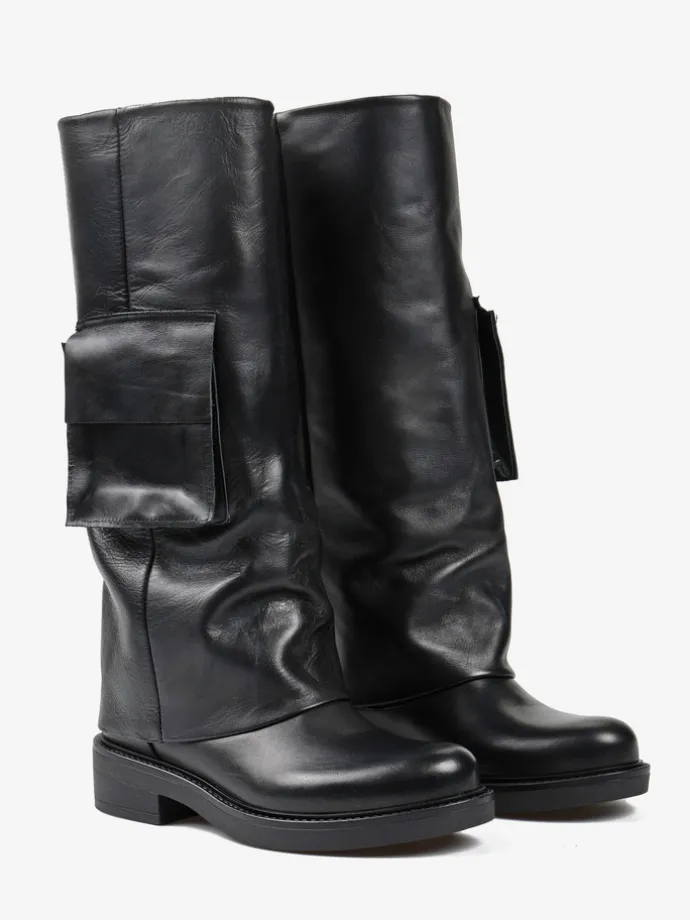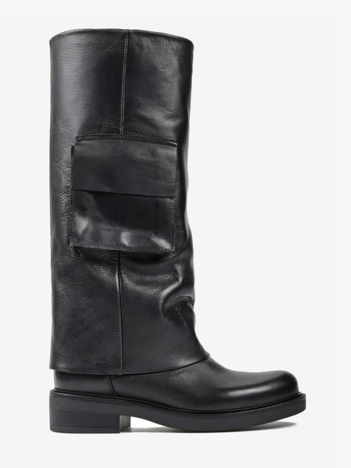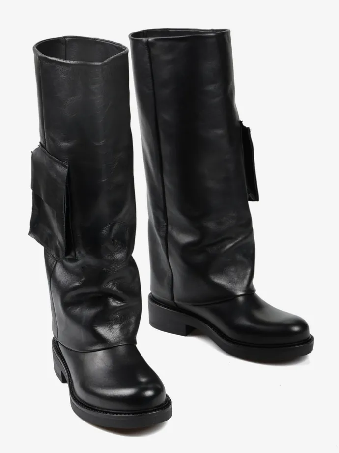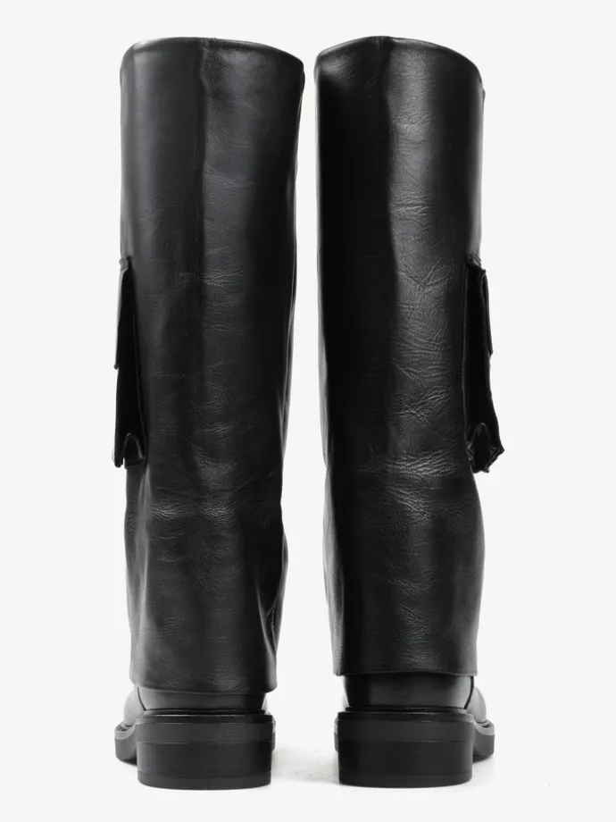 Wsuwane kozaki z szeroką cholewą i ozdobną kieszonką.