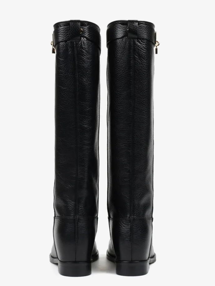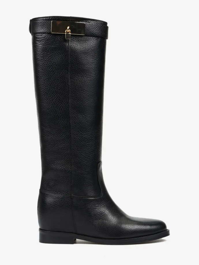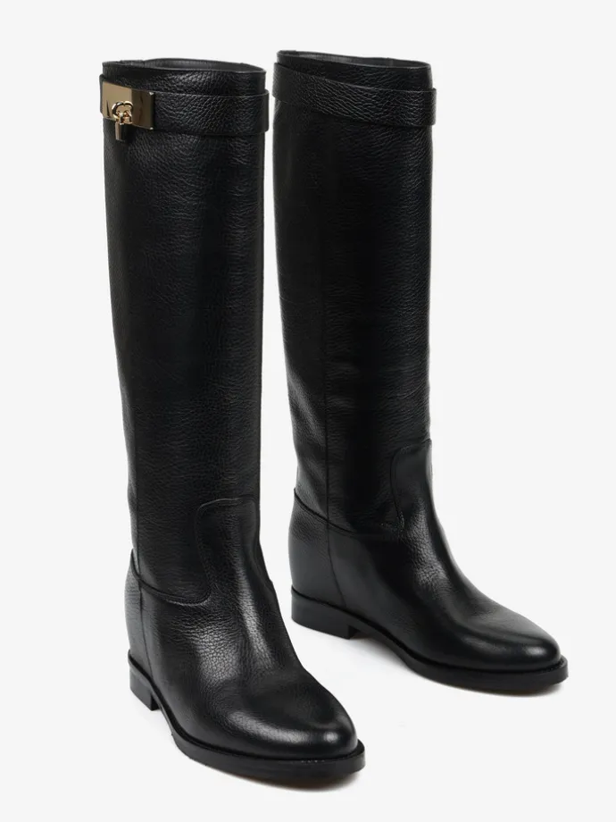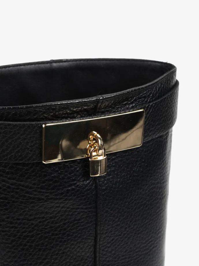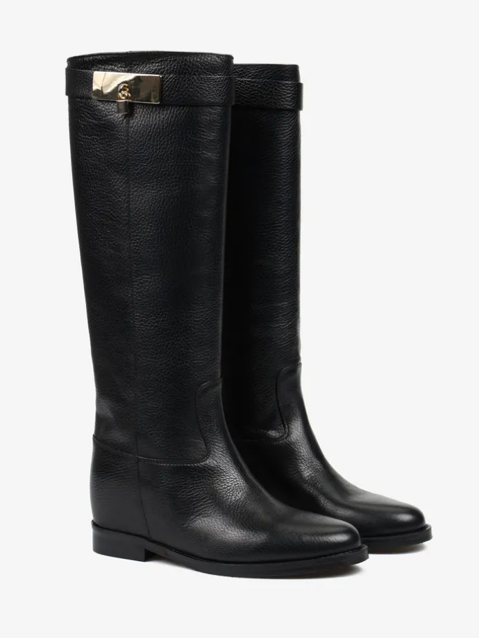 Wsuwane oficerki na ukrytym koturnie (ok. 5 cm). Ozdobny pasek ze złotą kłódką na cholewie.
