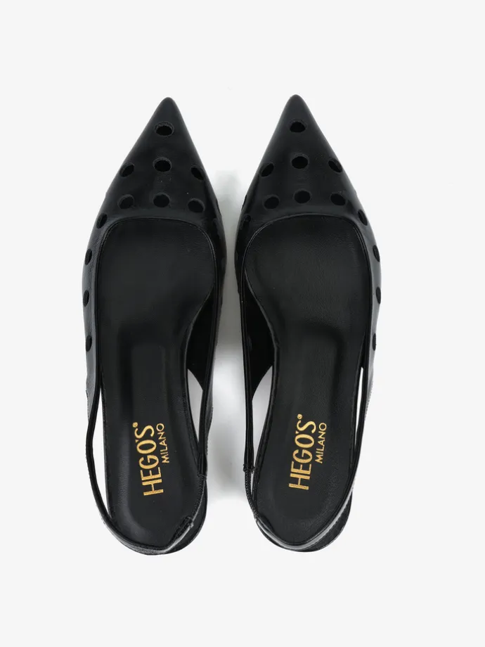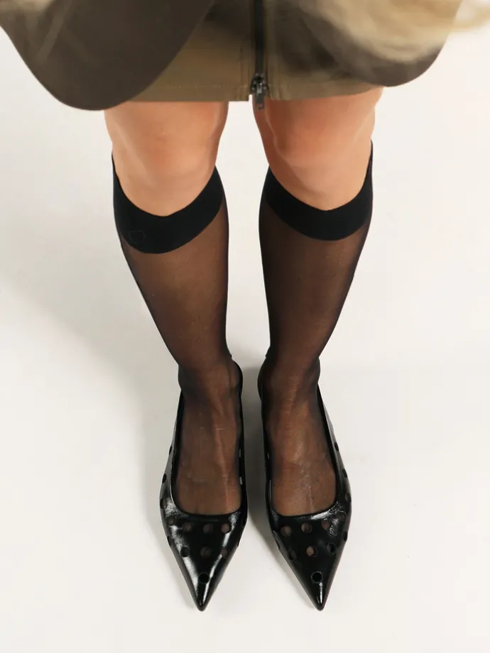 Ażurowe, lakierowane baleriny z noskiem w szpic. Odkryta pięta z paskiem dopasowującym się do stopy.