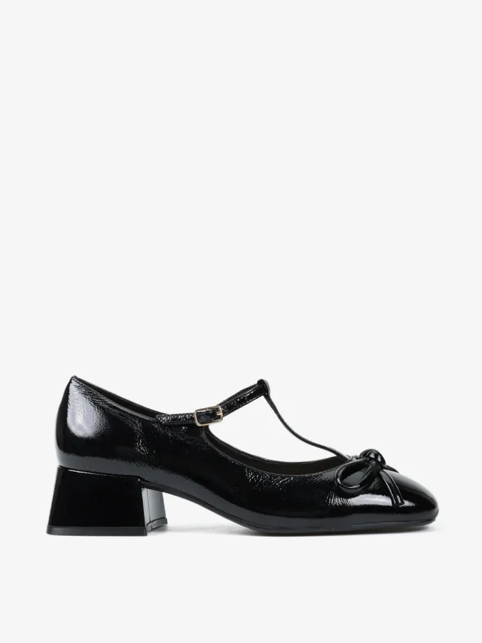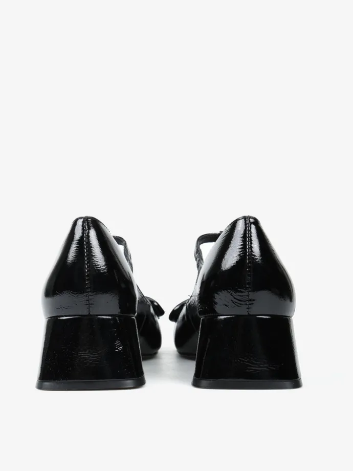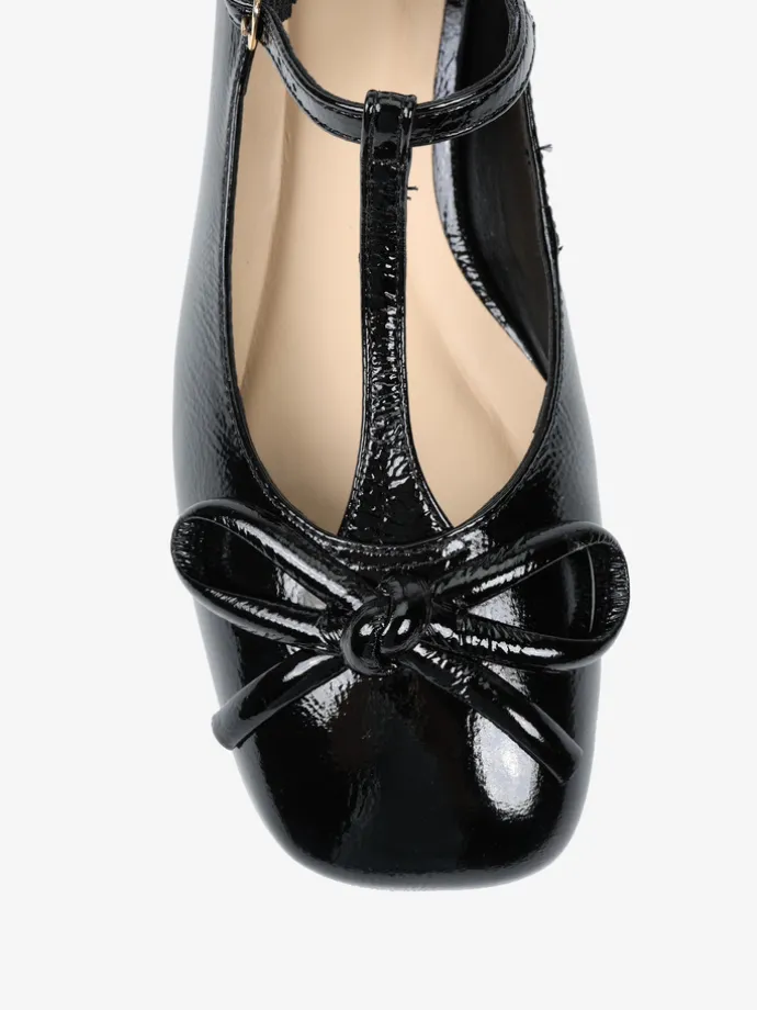 Lakierowane czółenka Mary Jane z paskiem na podbiciu i regulowanym zapięciem. Kwadratowy nosek z ozdobną kokardką.