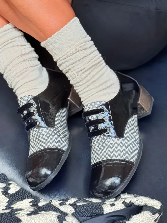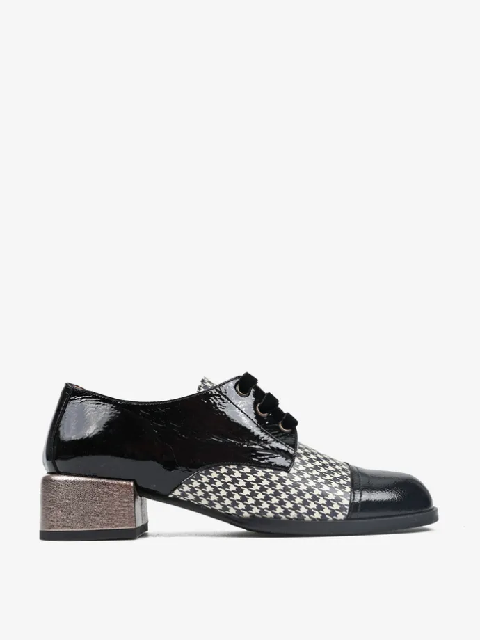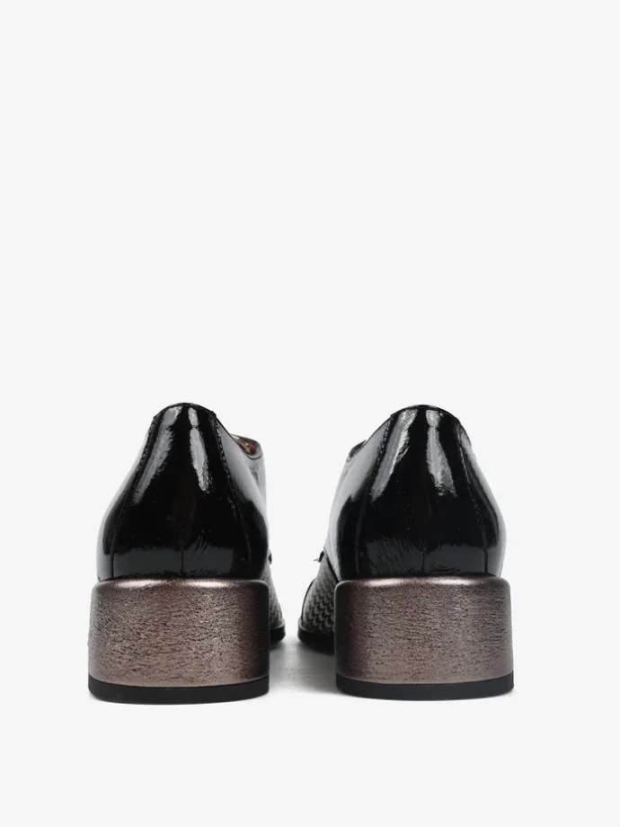 Półbuty na niskim, metalicznym słupku wykonane z lakierowanej skóry ze wzorzystą wstawką. Kwadratowe noski i welurowe sznurowadła.