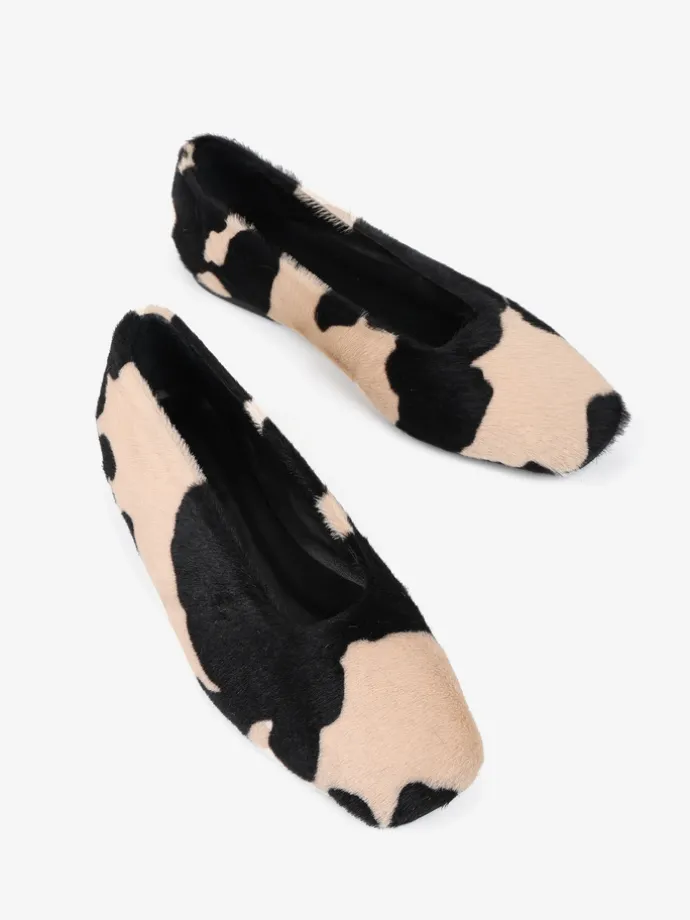 Baleriny COW PRINT, wykonane ze skóry z włosiem w beżowo-czarne łaty. Kwadratowe noski i wycięcie z zabudowanymi brzegami.