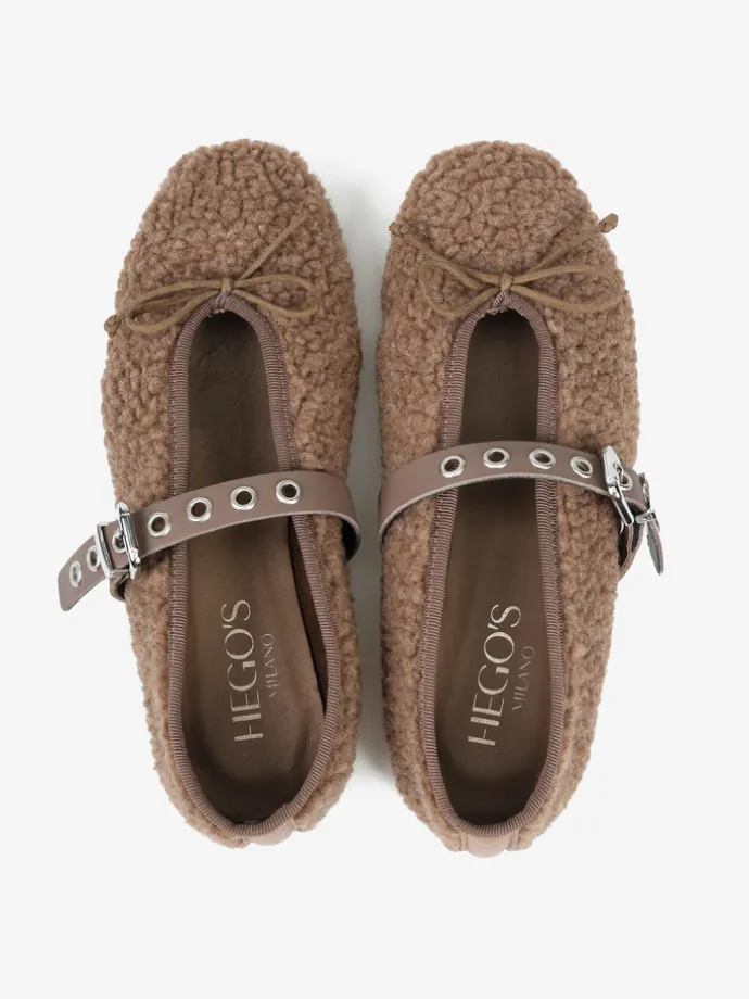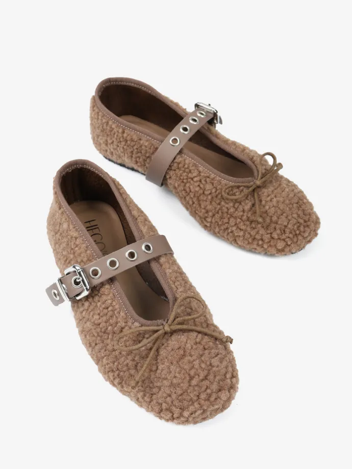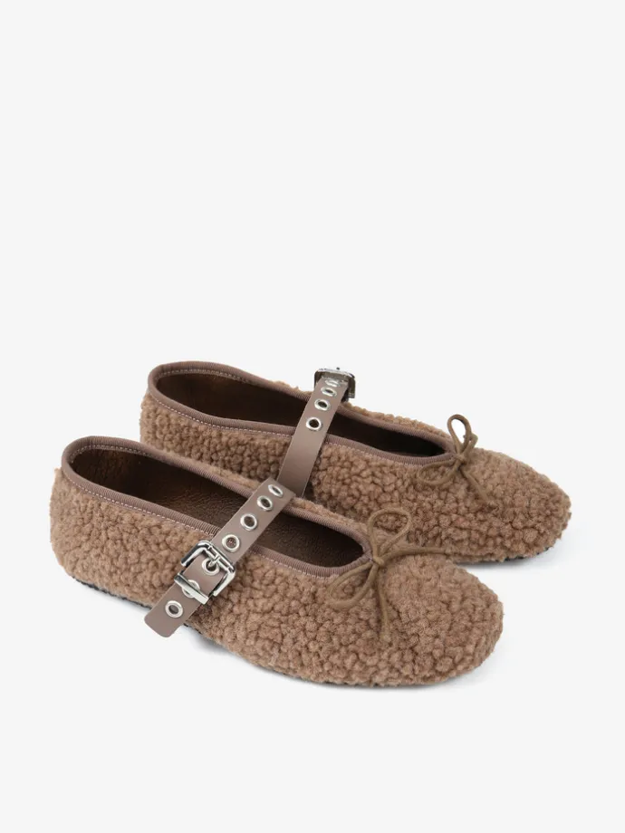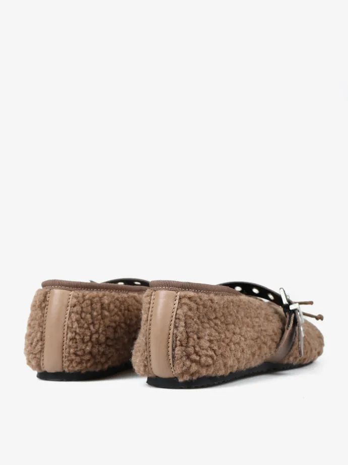 Baleriny z tkaniny imitującej futro baranka. Wiązana kokardka i regulowany pasek umożliwiają idealne dopasowanie.