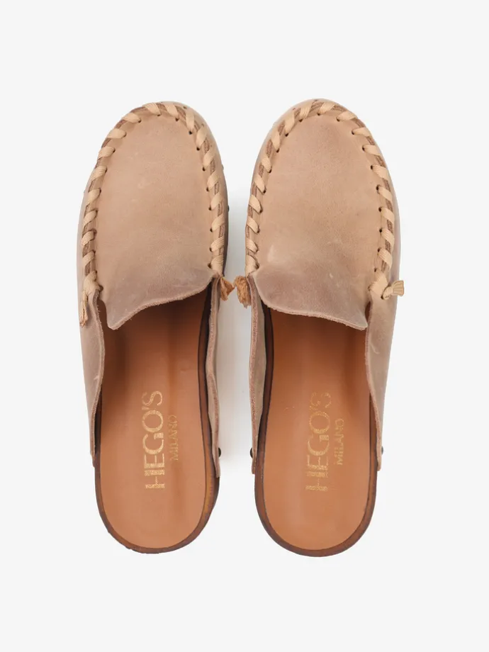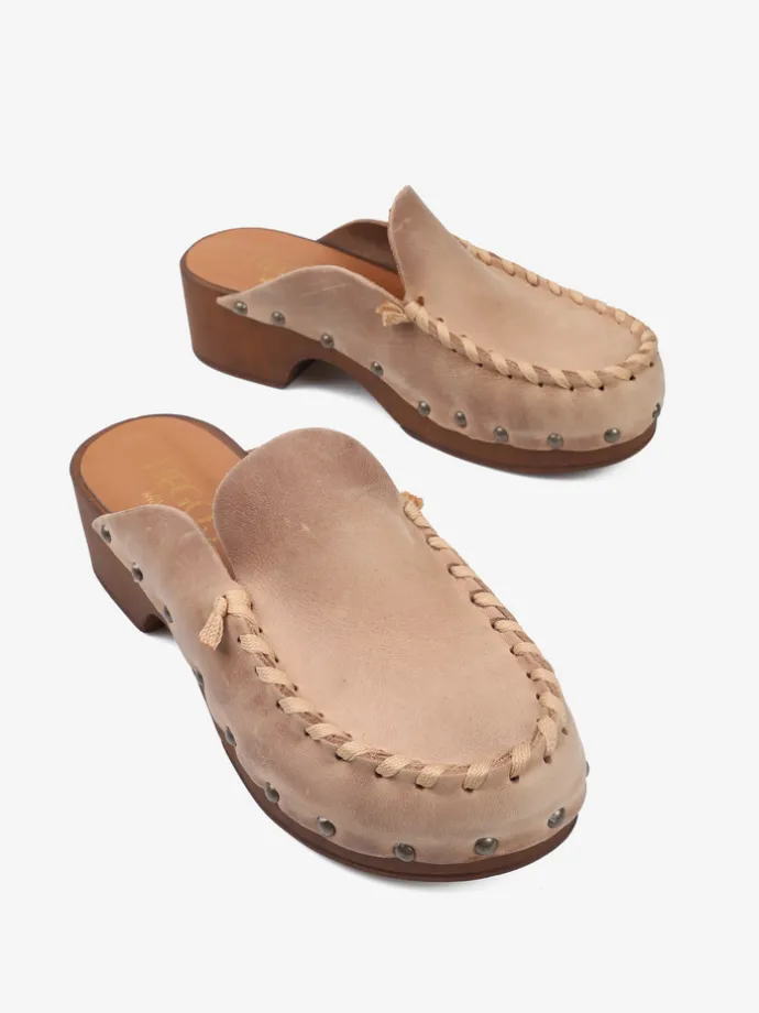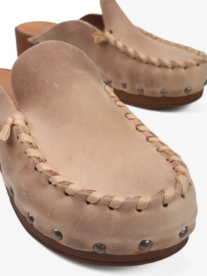 Zamszowe chodaki z ćwiekami i ozdobnym, widocznym szwem.