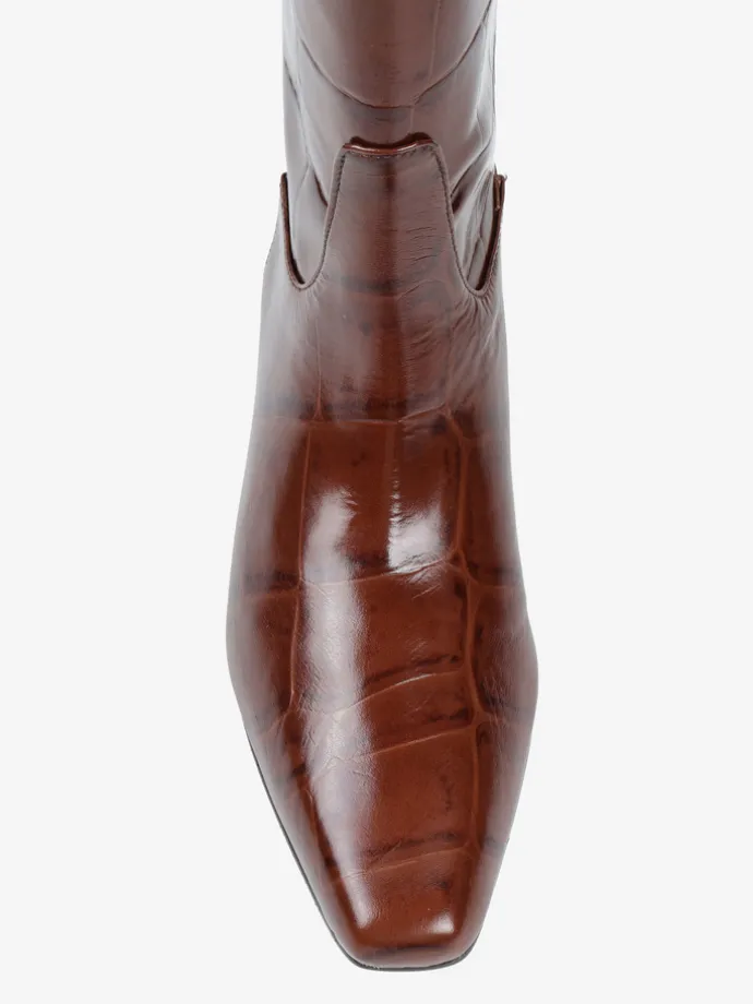 Wsuwane kozaki w kowbojskim stylu, wykonane ze skóry wysoko polerowanej tłoczonej w krokodyli wzór.