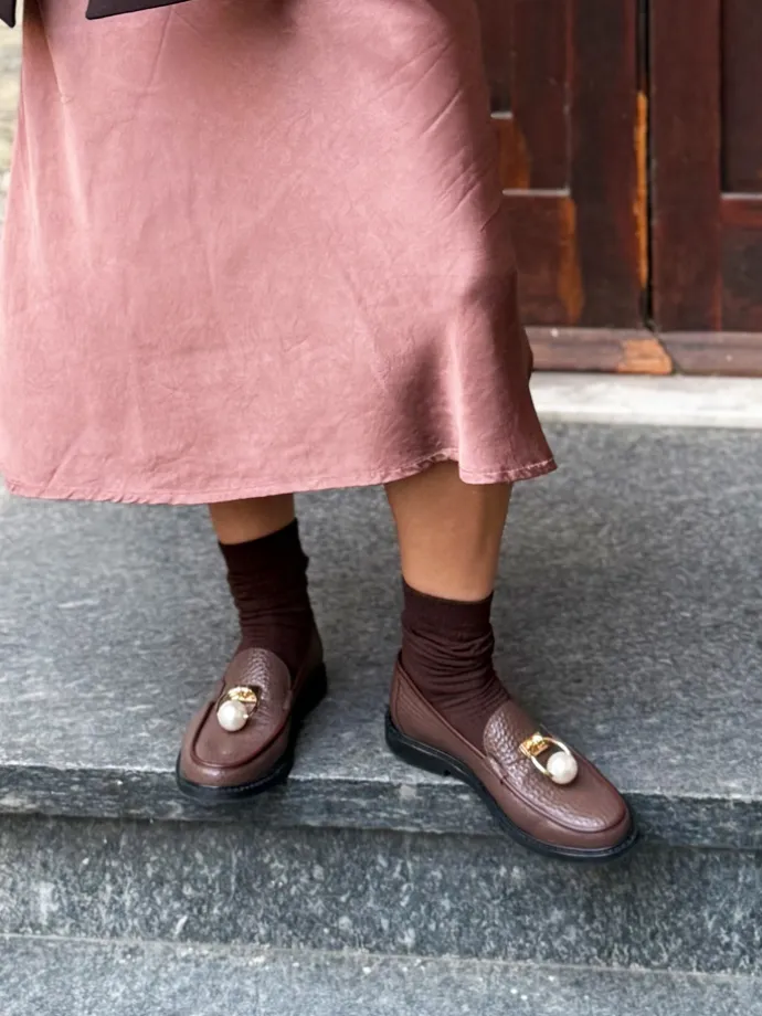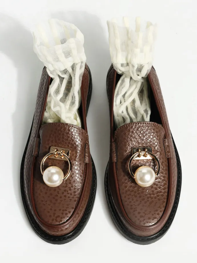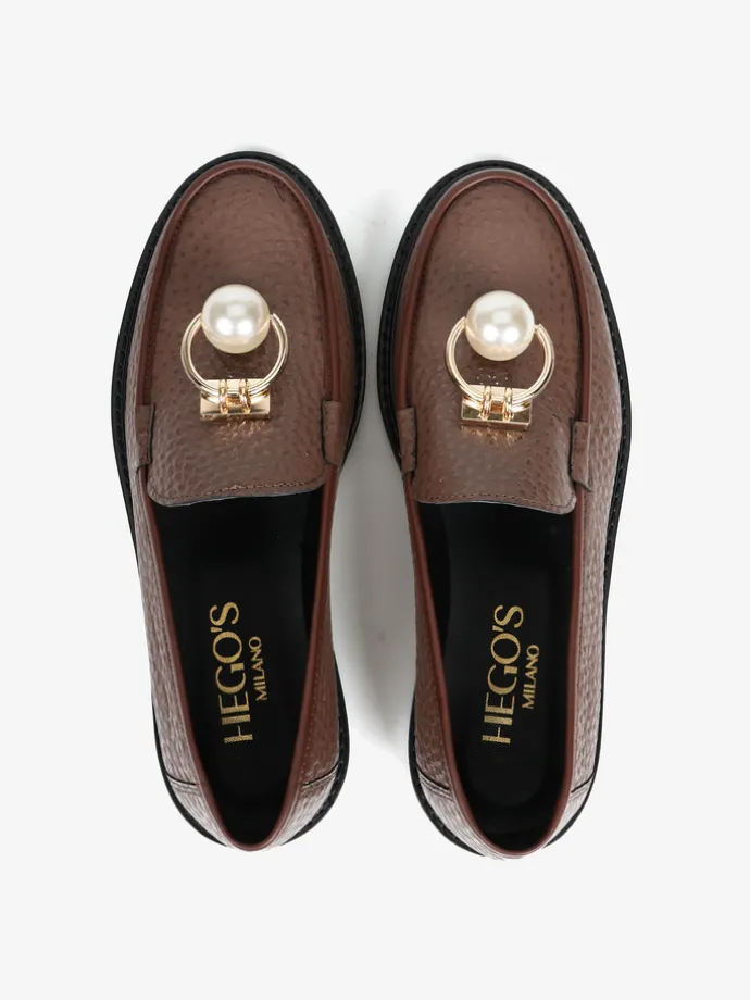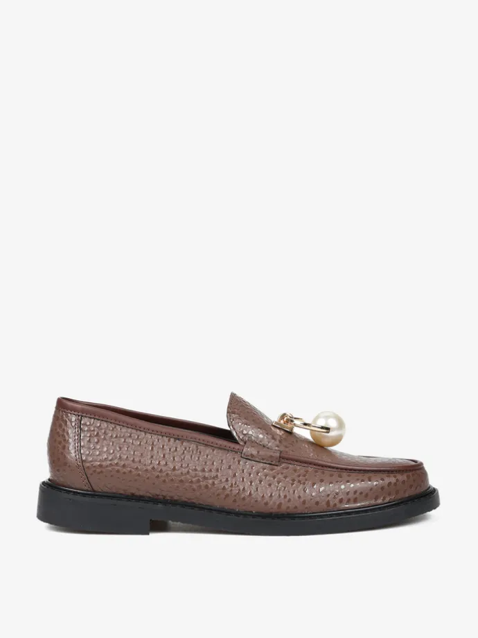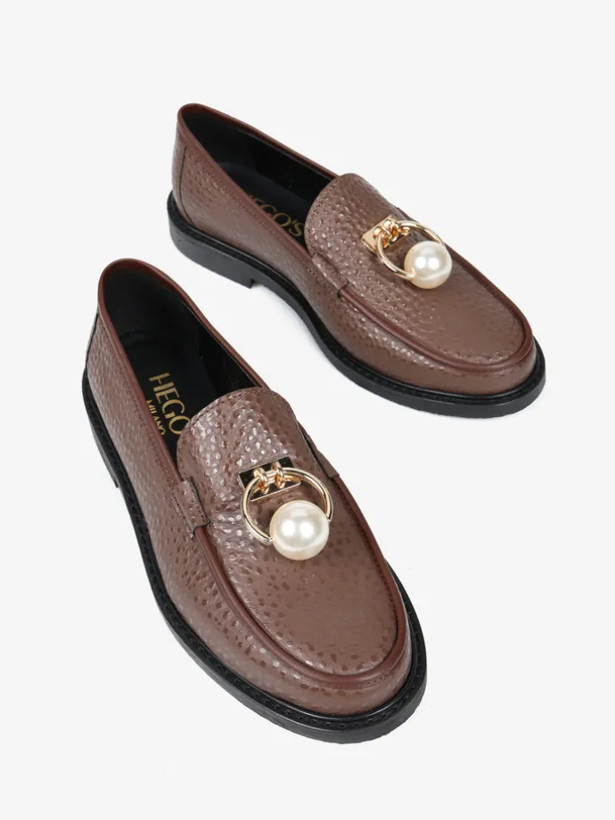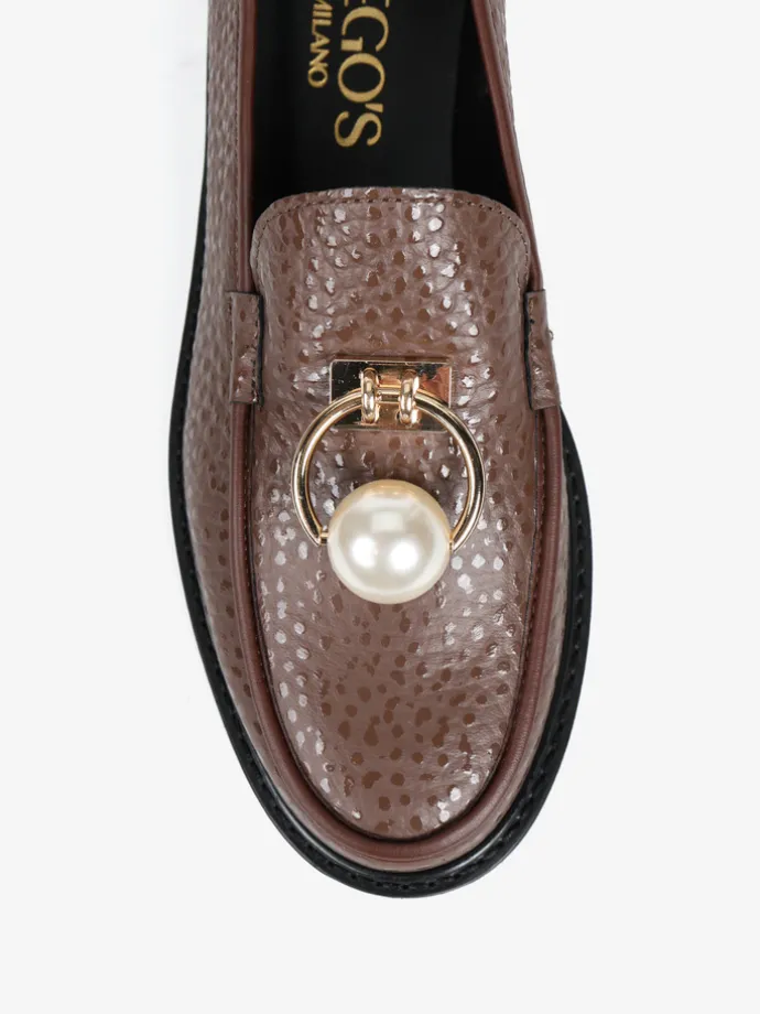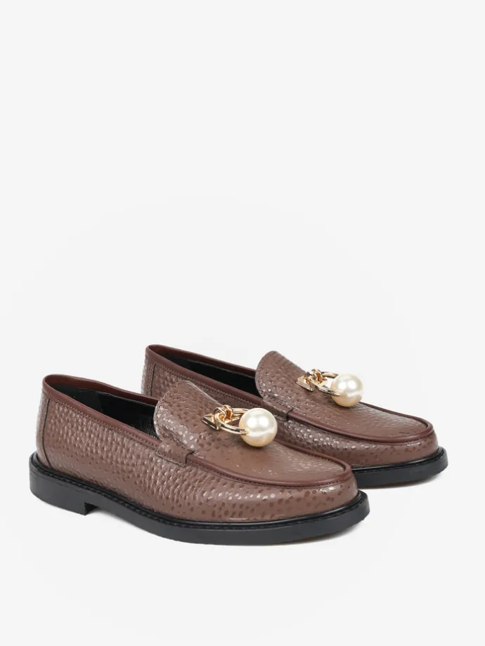 Brązowe mokasyny wykonane z mięsistej skóry. Biżuteryjna aplikacja z perłą.