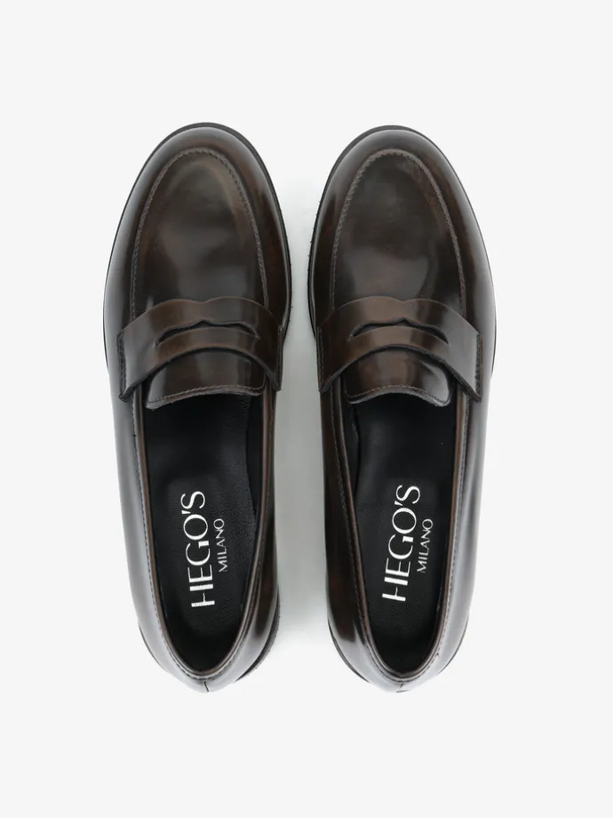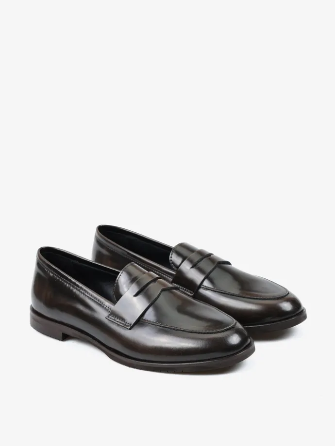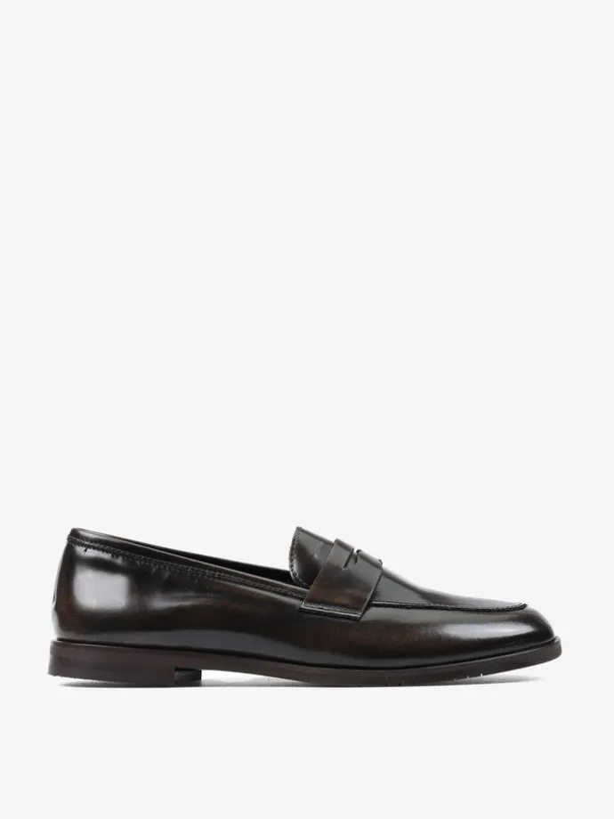Klasyczne mokasyny z patką, wykonane z wysokopolerowanej skóry z delikatnym efektem sprania.