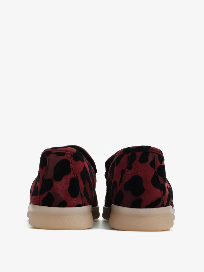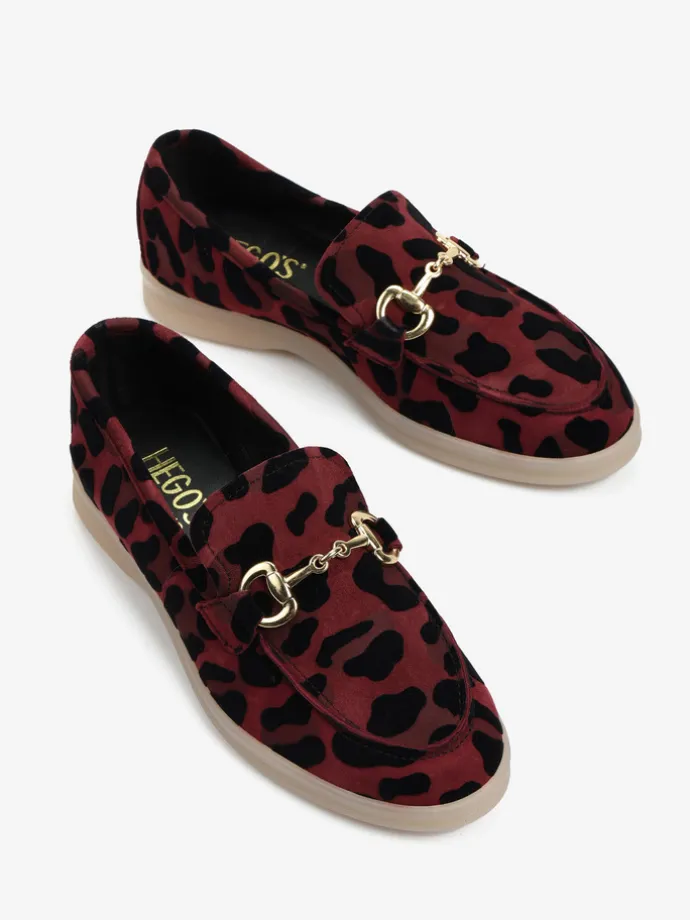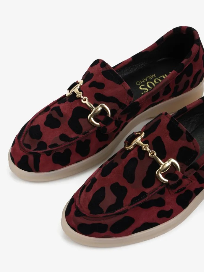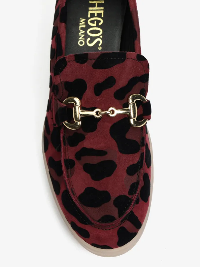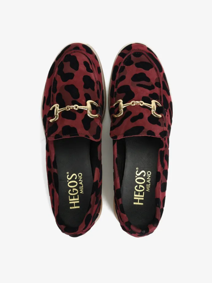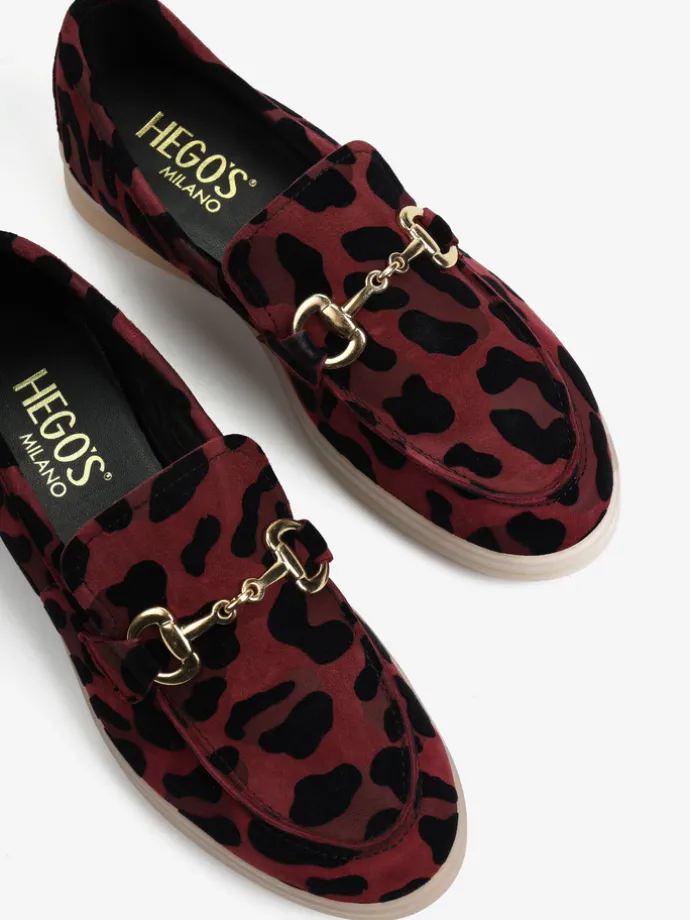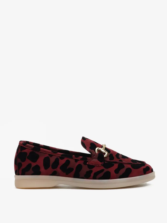 Mokasyny wykonane z zamszu ze wzorem w panterkę. Delikatnie przezroczysta podeszwa i metalowe wędzidło.