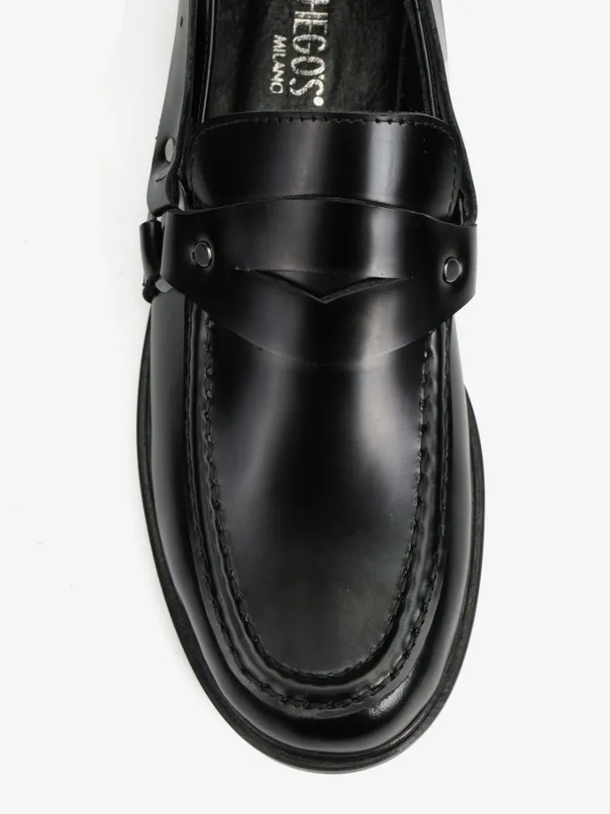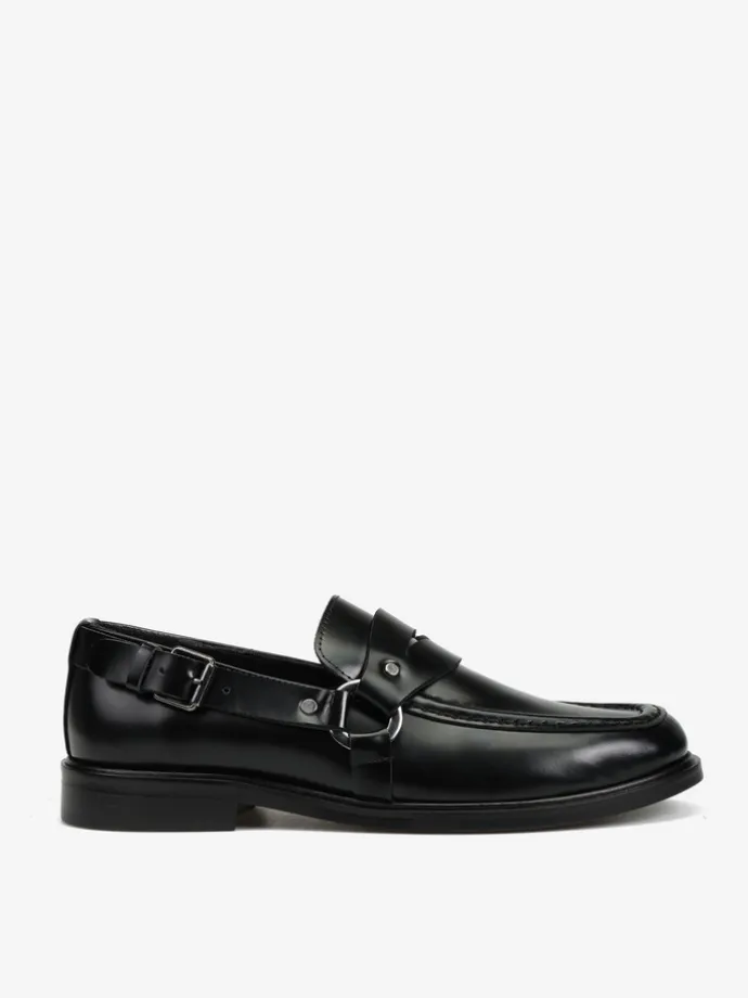 Mokasyny wykonane ze skóry wysoko polerowanej. Ozdobna patka i pasek z wędzidłem z boku cholewki.