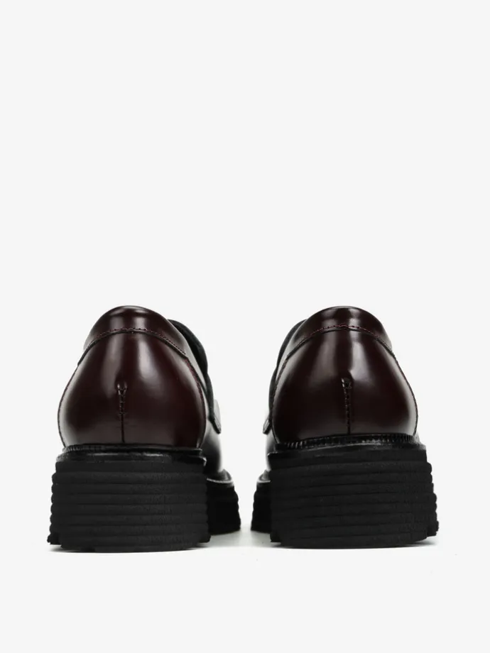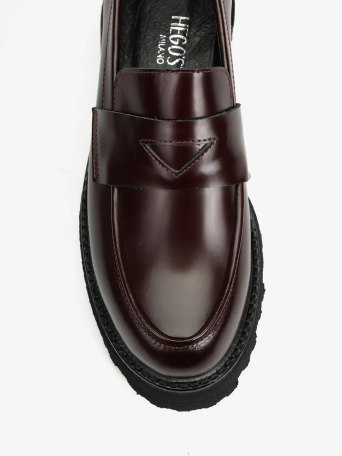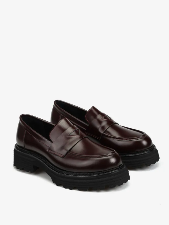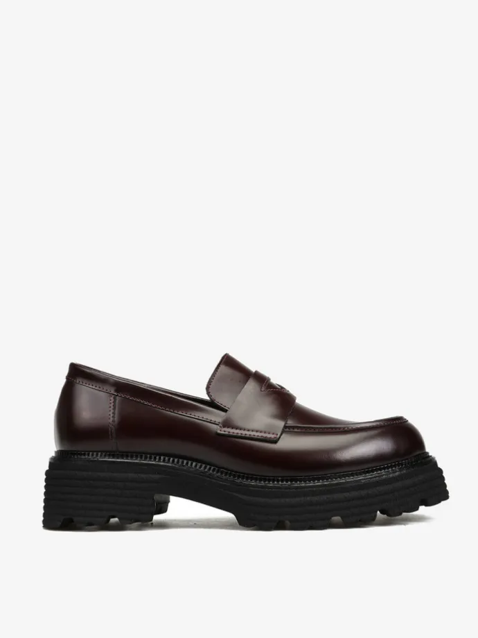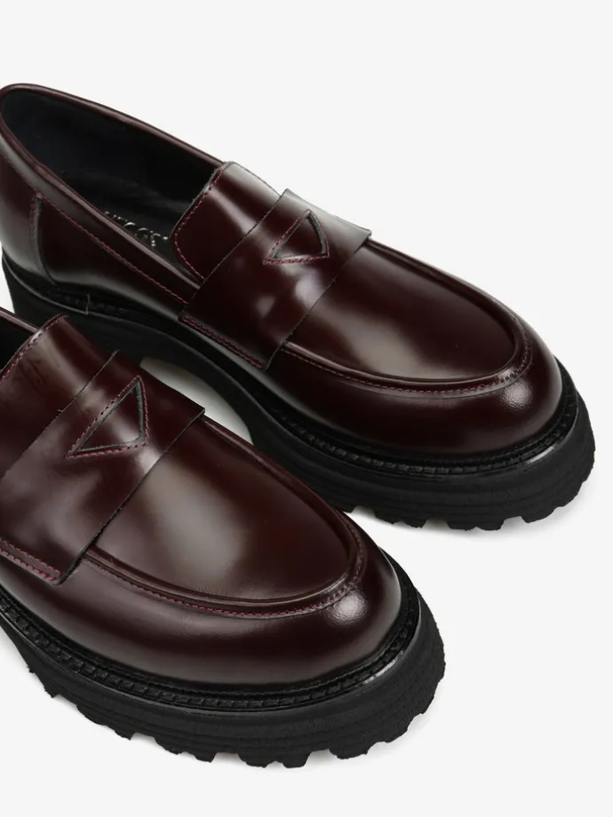Mokasyny na platformie wykonane ze skóry wysoko polerowanej. Ozdobna patka z trójkątnym wycięciem.