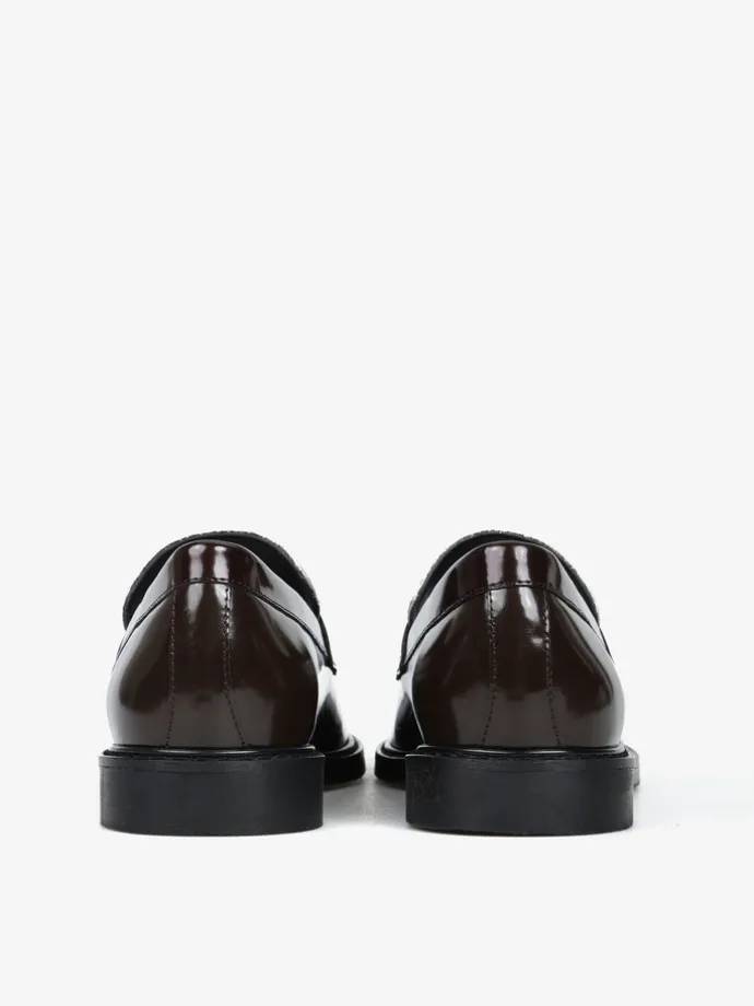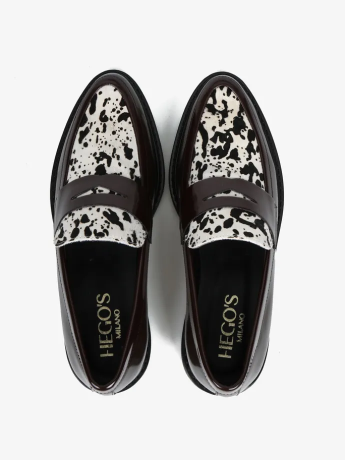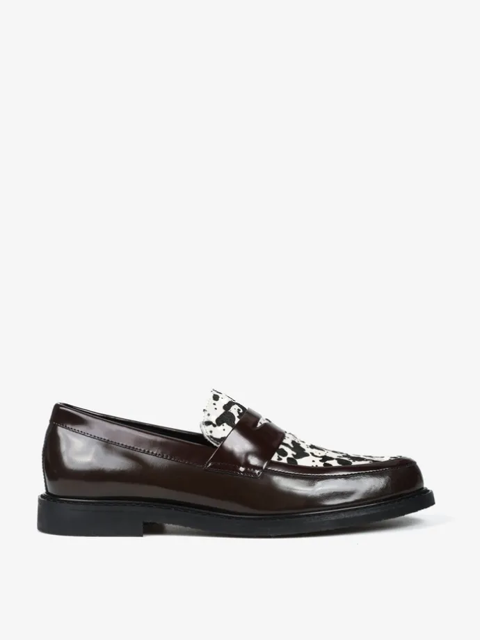 Mokasyny z patką wykonane z wysokopolerowanej, brązowej skóry. Ozdobna wstawka ze skóry z włosiem.