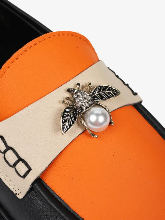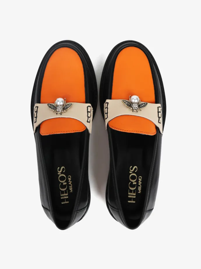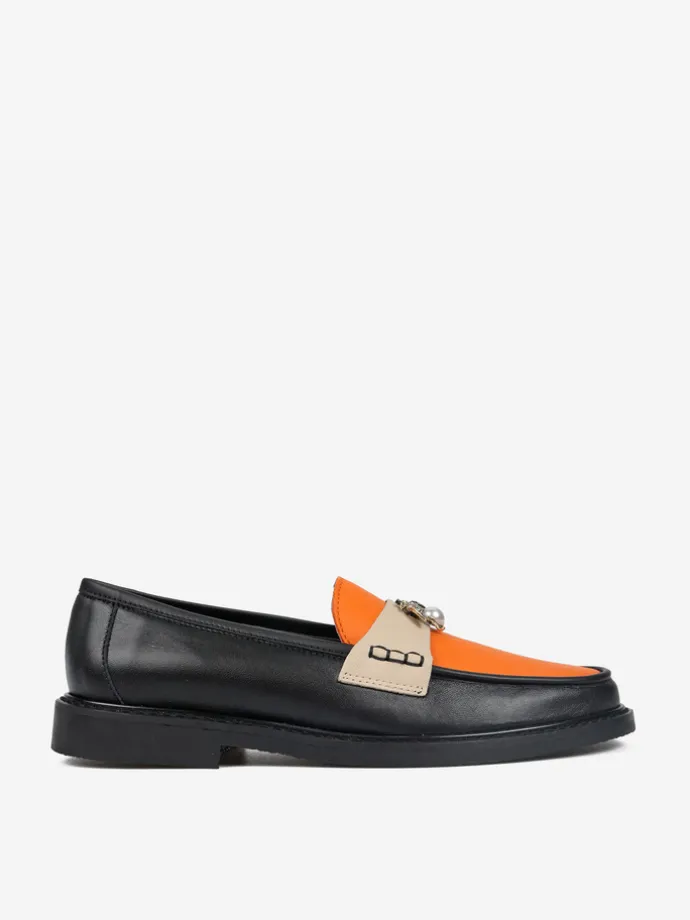 Mokasyny z kontrastującym, pomarańczowym językiem wykonane z miękkiej i delikatnej skóry. Beżowa patka z biżuteryjną aplikacją.