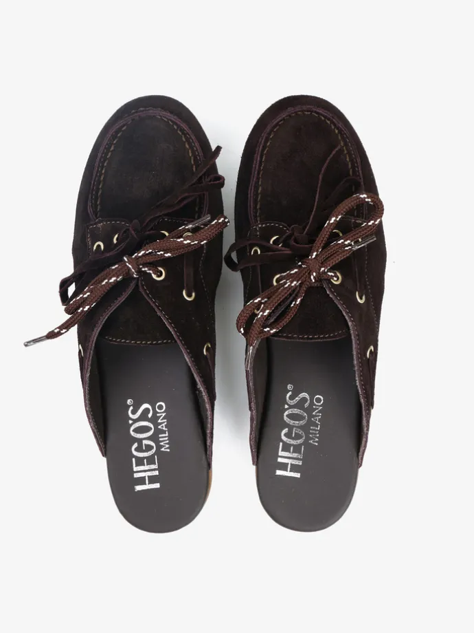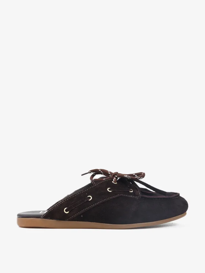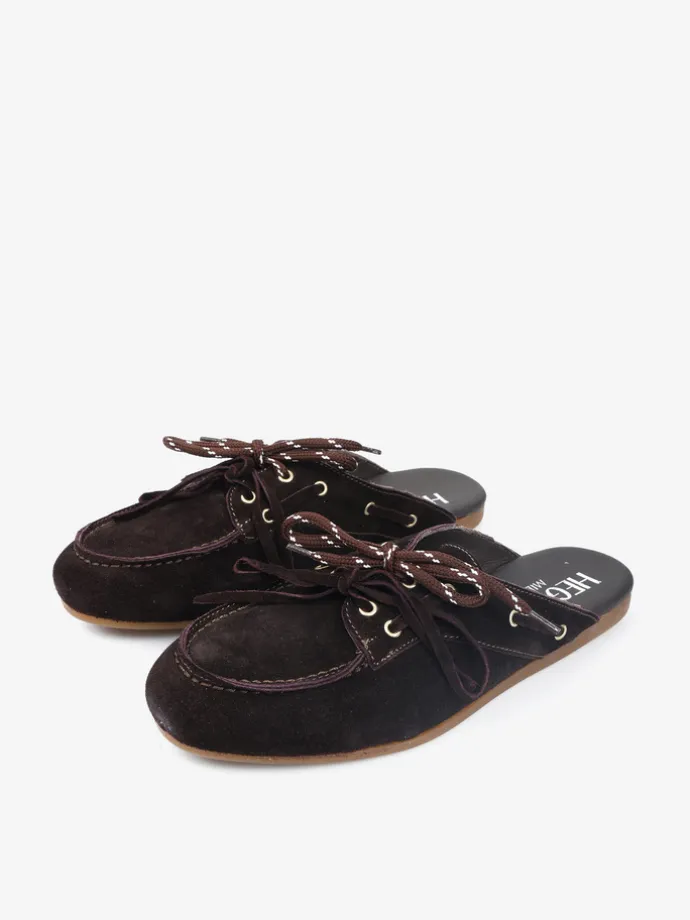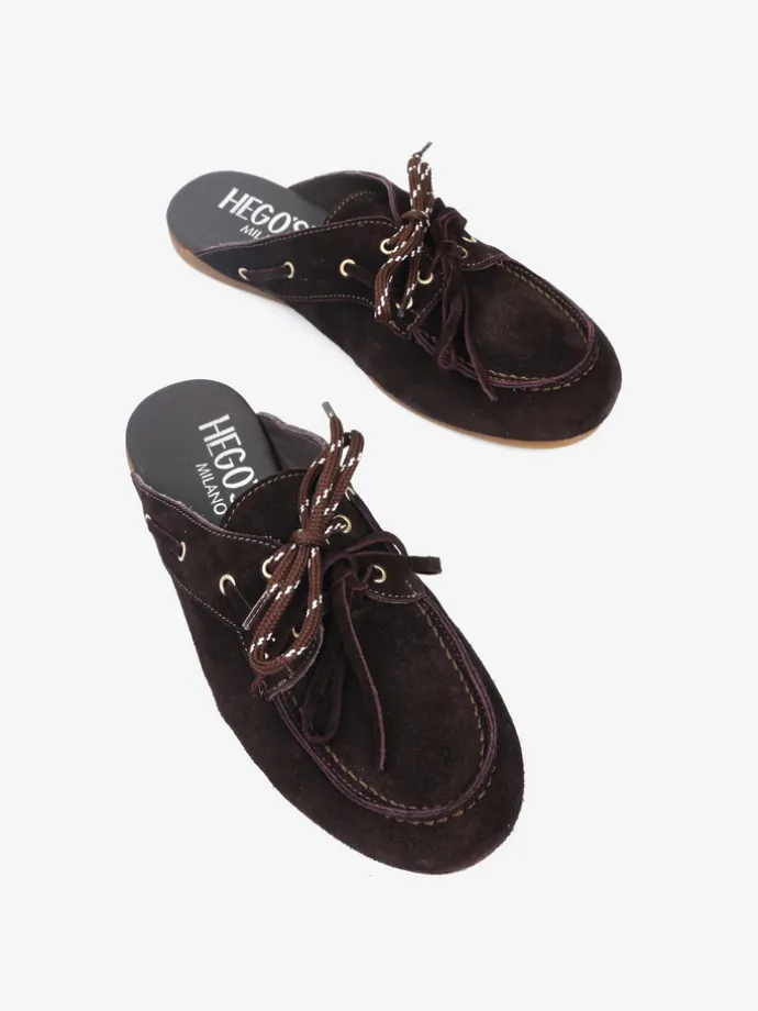 Zamszowe mule z wiązaniem pozwalającym na idealne dopasowanie. Dodatkowe sznurowadła w brązowym kolorze.