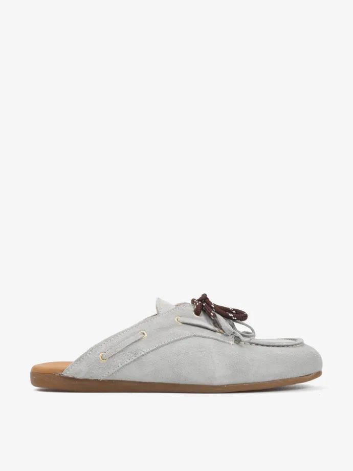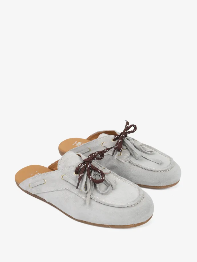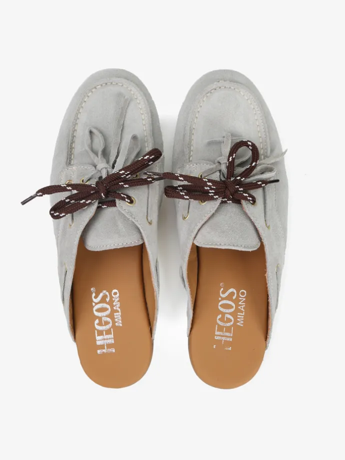 Zamszowe mule z wiązaniem pozwalającym na idealne dopasowanie. Dodatkowe sznurowadła w brązowym kolorze.