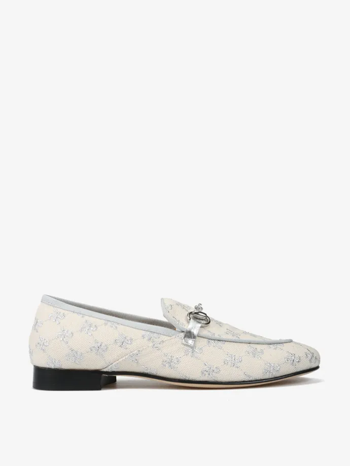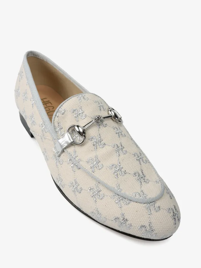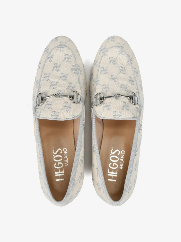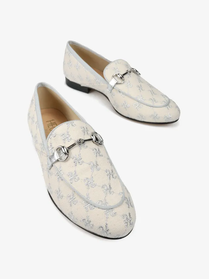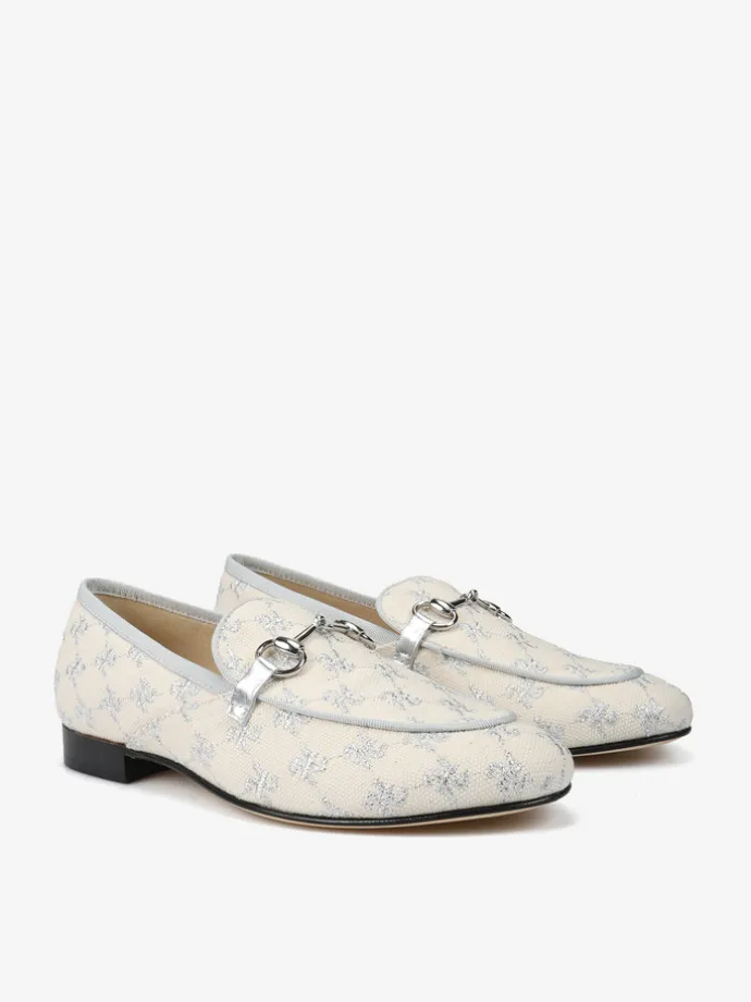 Mokasyny z haftowanym monogramem i metalowym wędzidłem.