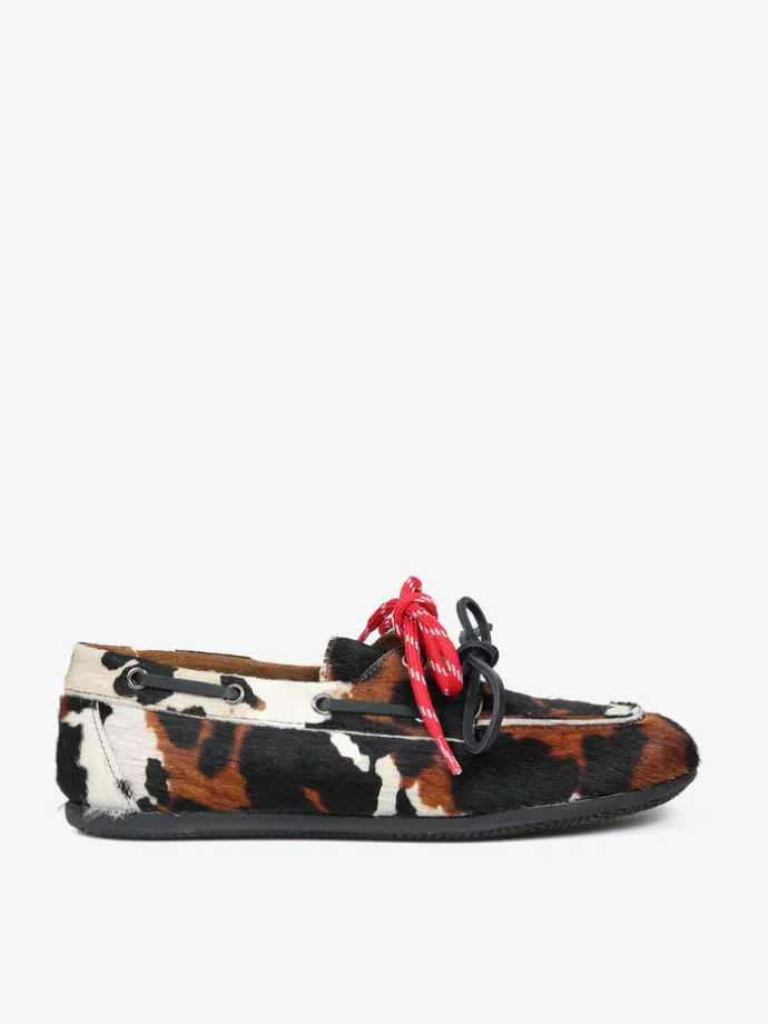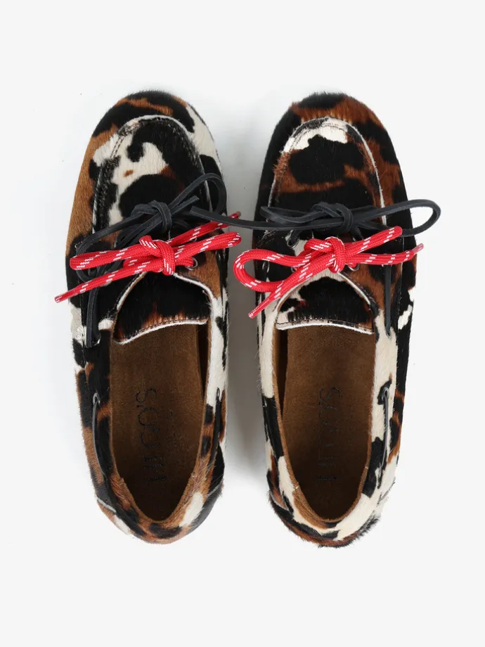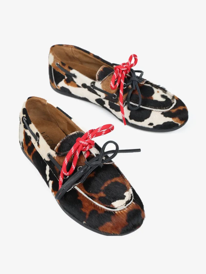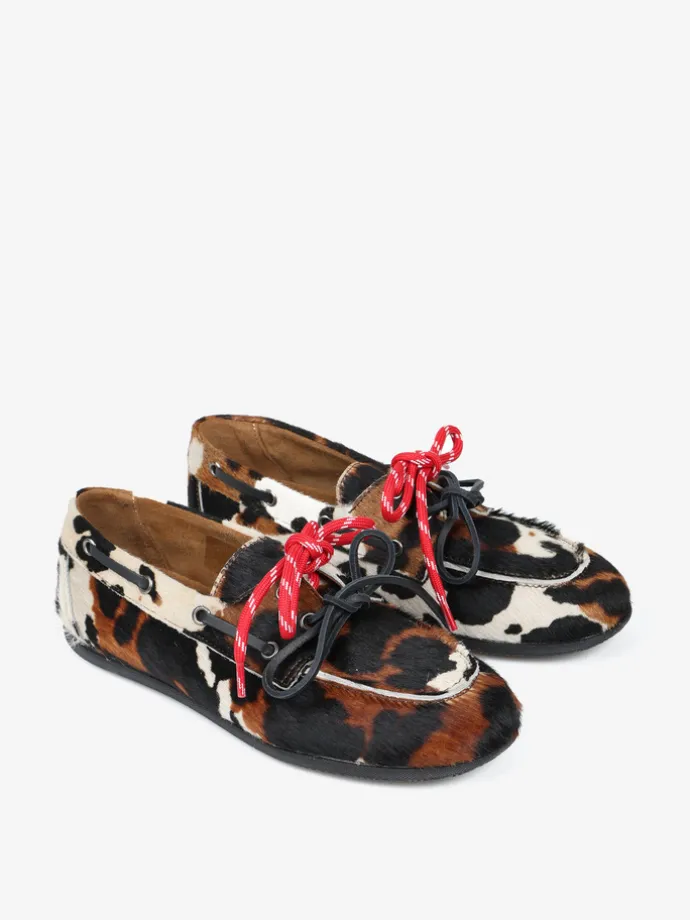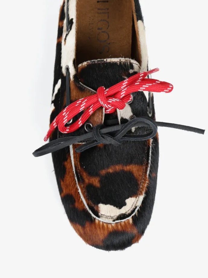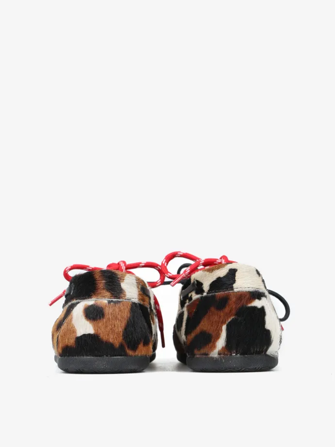Mokasyny wykonane ze skóry z włosiem, z wiązaniem pozwalającym na idealne dopasowanie. Dodatkowe sznurowadła w kontrastującym, czerwonym kolorze.