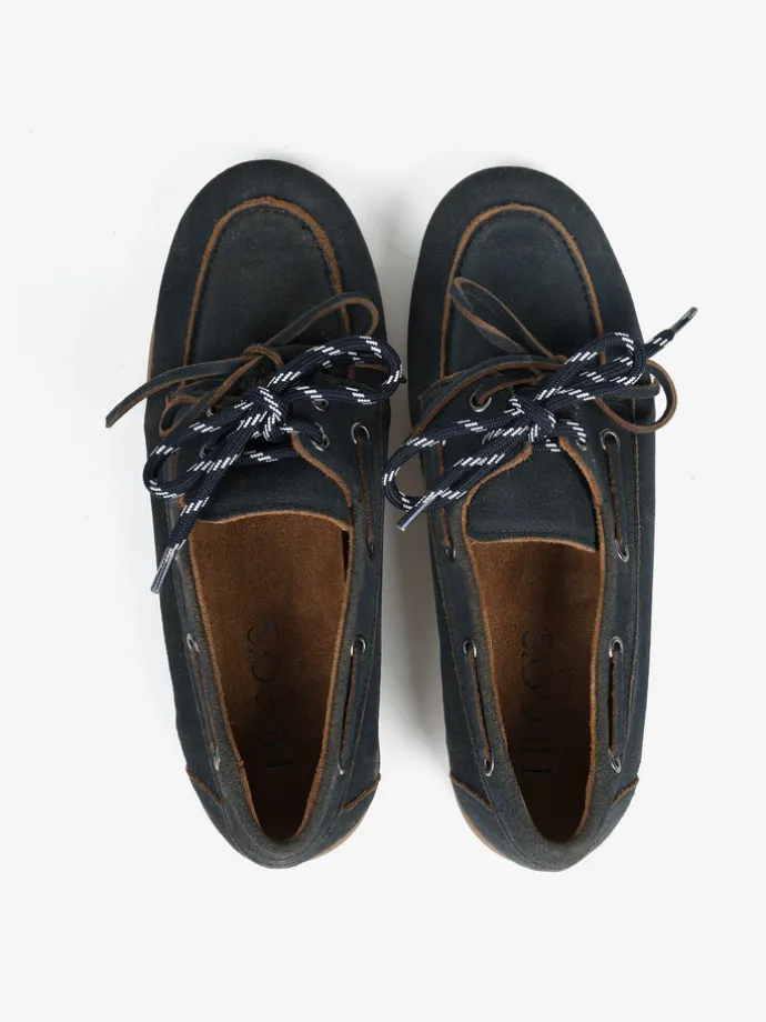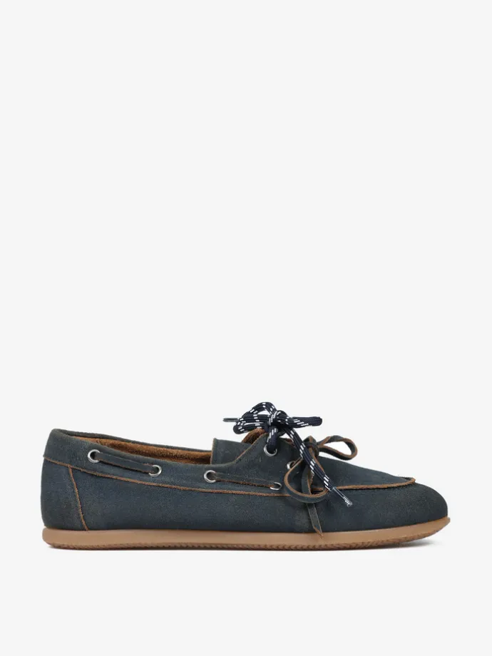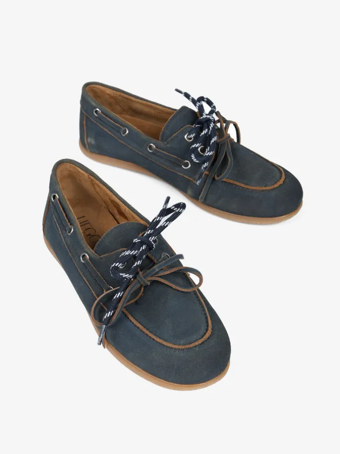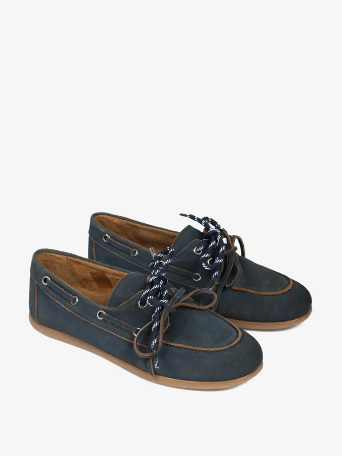 Zamszowe mokasyny z wiązaniem pozwalającym na idealne dopasowanie. Dodatkowa para granatowych sznurowadeł.