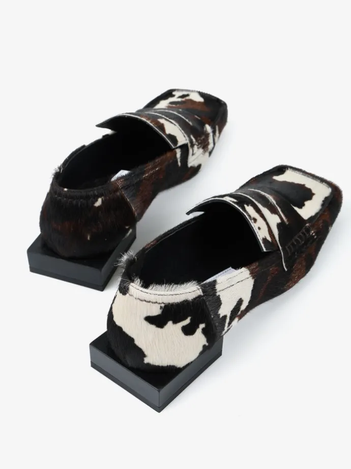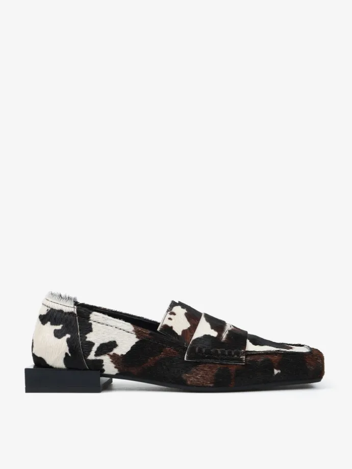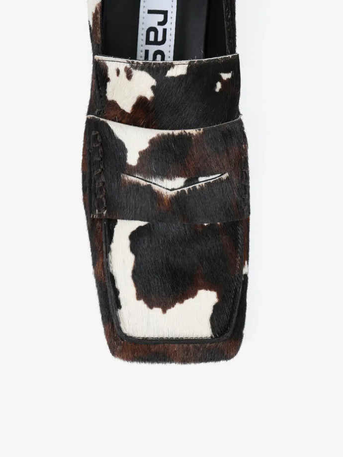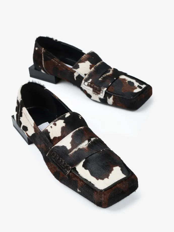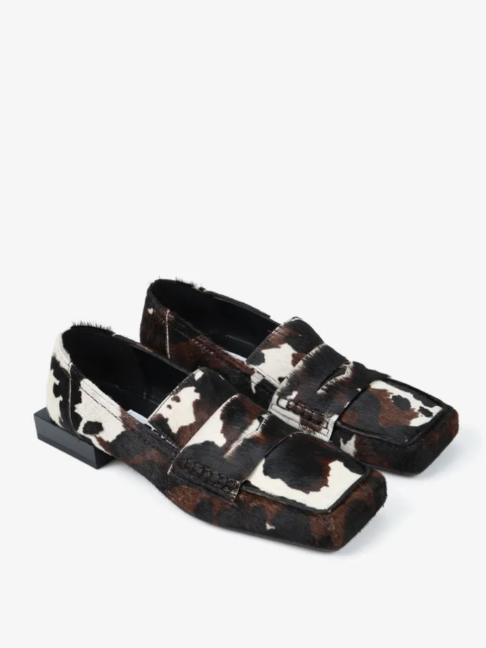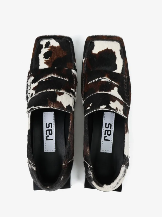 Mokasyny RAS na niskim klocku, wykonane ze skóry z włosiem w zwierzęcy wzór. Ozdobna patka i kwadratowe noski.