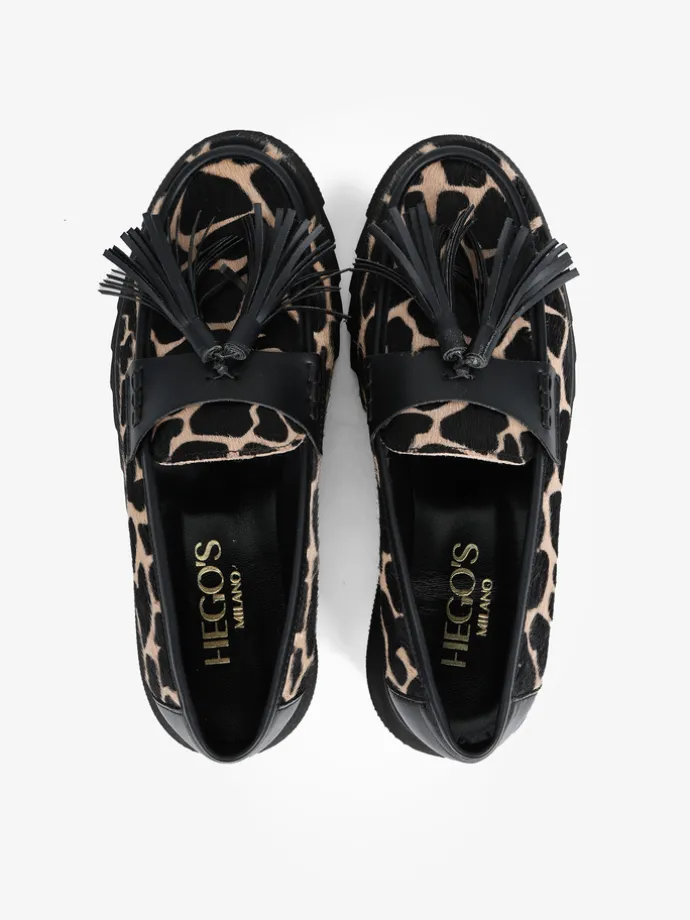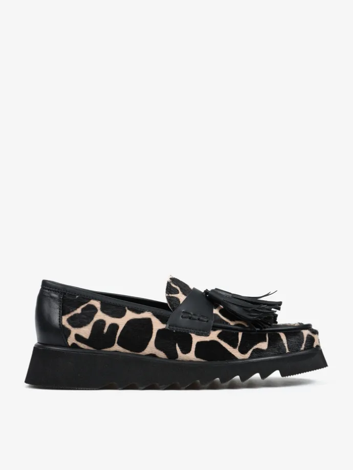 Mokasyny na efektownej podeszwie wykonane z naturalnej skóry z włosiem w zwierzęcy wzór. Ozdobna patka z frędzlami.