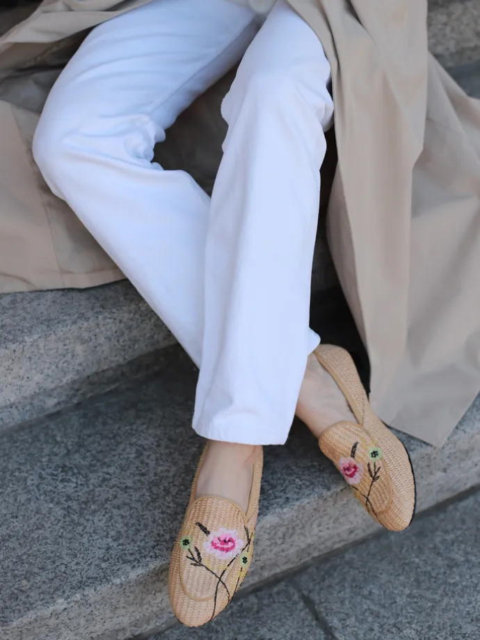Mokasyny wykonane z rafii z ozdobnymi, haftowanymi kwiatami.