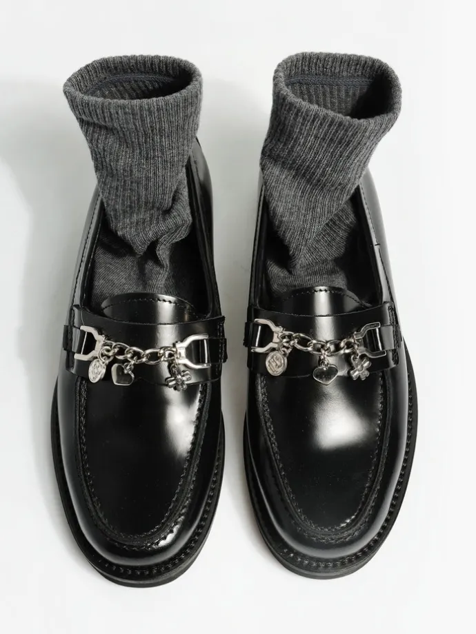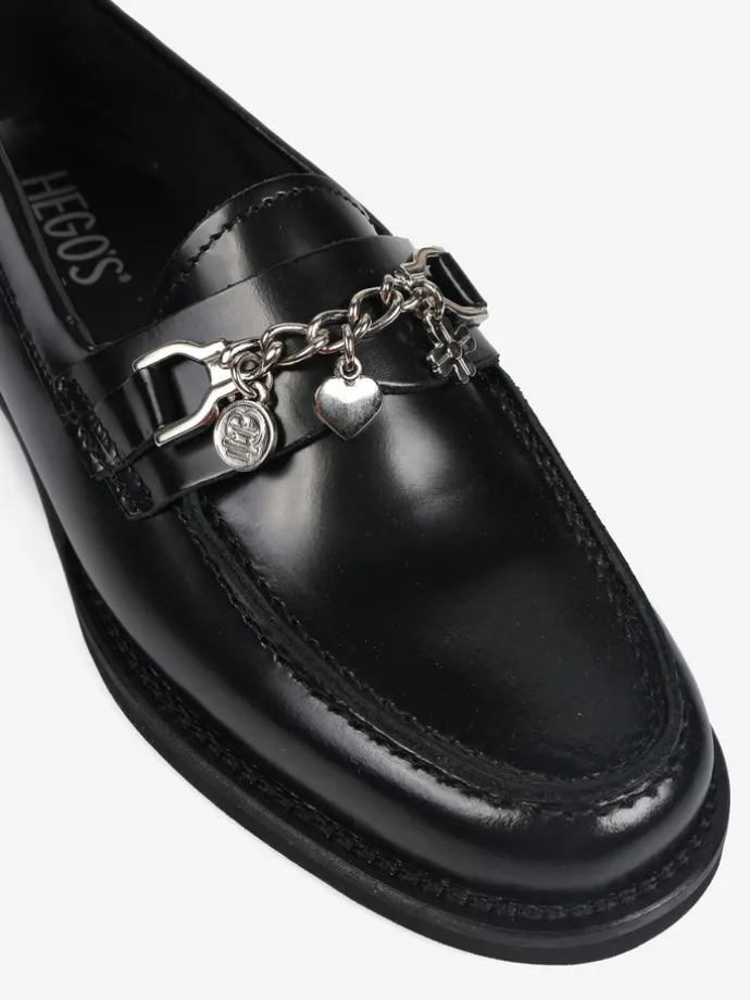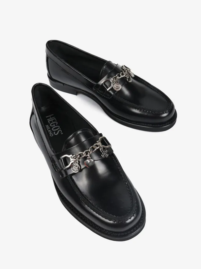 Klasyczne mokasyny wykonane z wysokopolerowanej skóry. Ozdobna patka z łańcuszkiem i zawieszkami.