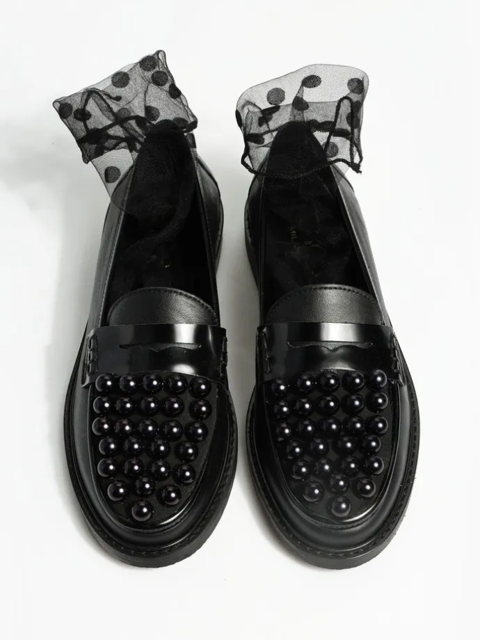 Mokasyny z ozdobnymi perłami i patką z połyskiem. Wykonane z miękkiej, delikatnej skóry.