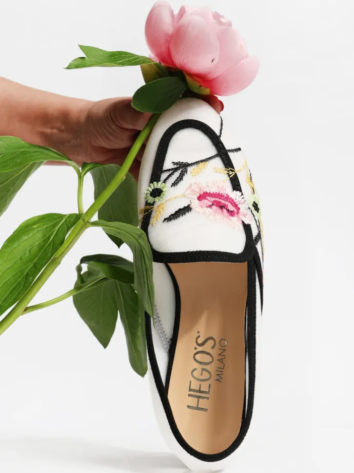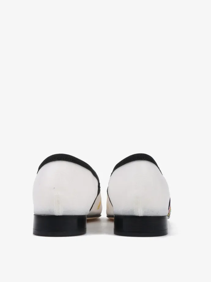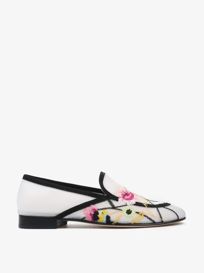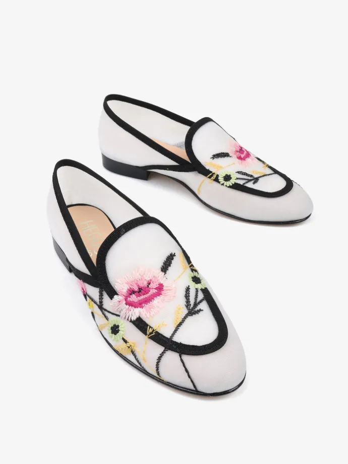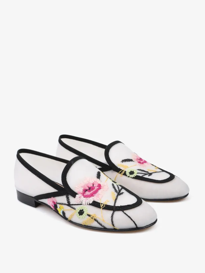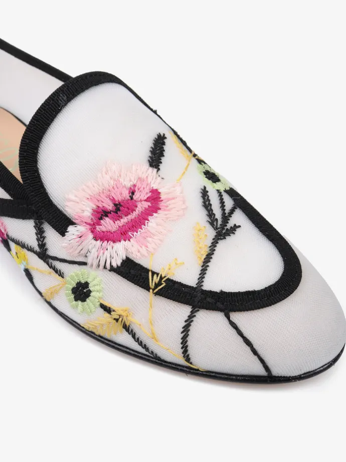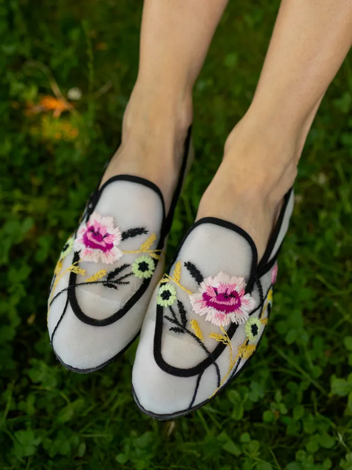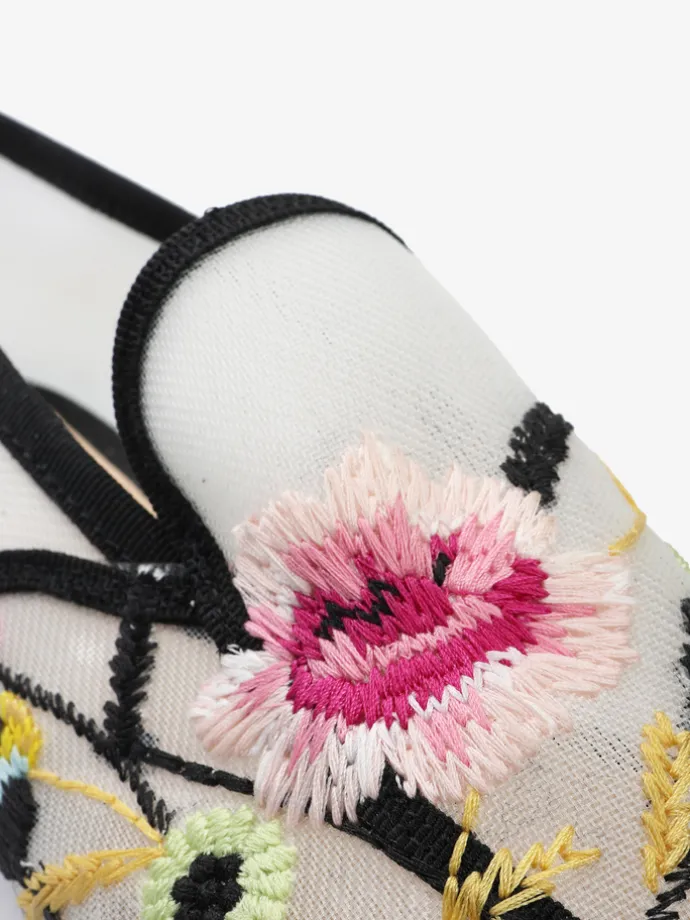 Mokasyny z przewiewnej siateczki z ozdobnym haftem w kwiaty.