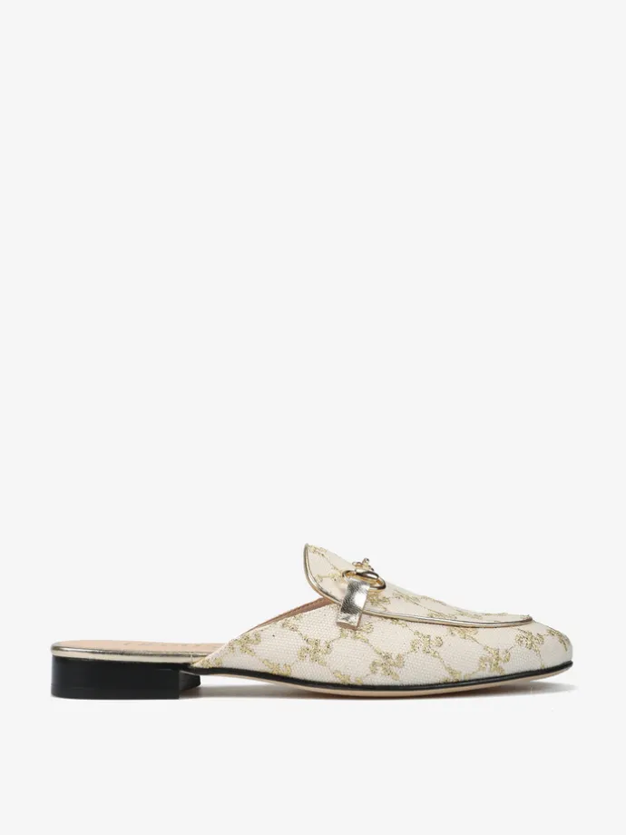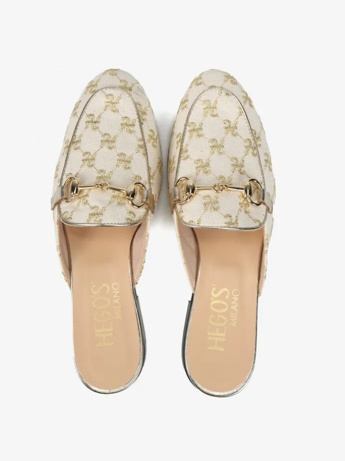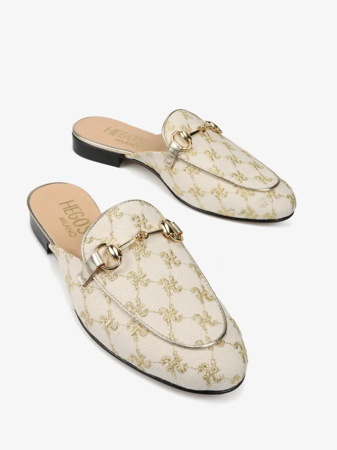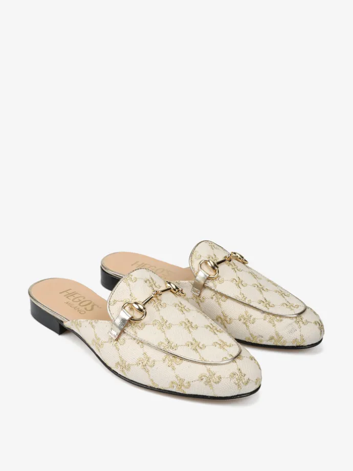 Materiałowe mule z haftowanym monogramem i złotym wędzidłem.
