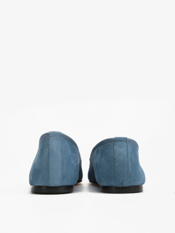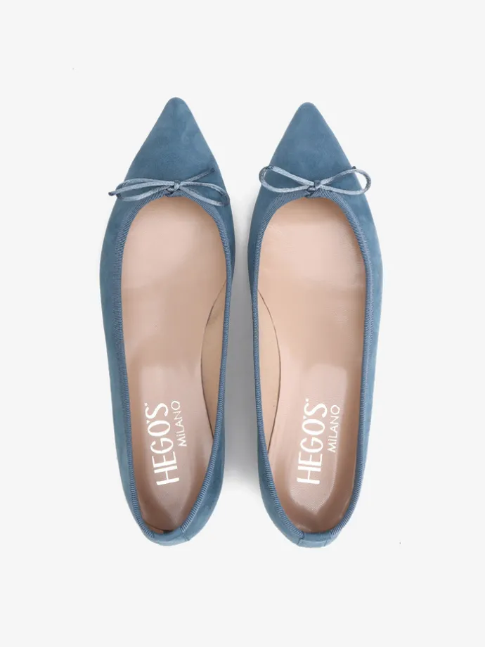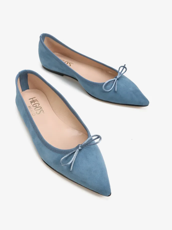 Baleriny z noskiem w szpic wykonane z modnego w tym sezonie zamszu. Wiązana kokardka umożliwia regulację dopasowania.