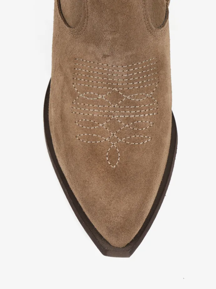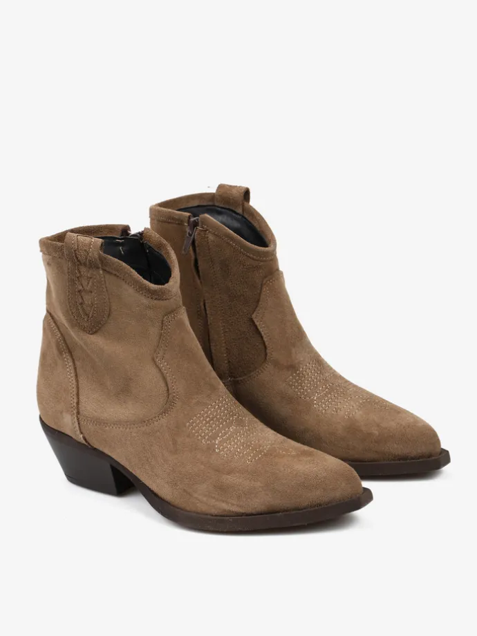 Niskie, zamszowe kowbojki z monochromatycznym haftem na nosku i zapięciem na suwak przy kostce.