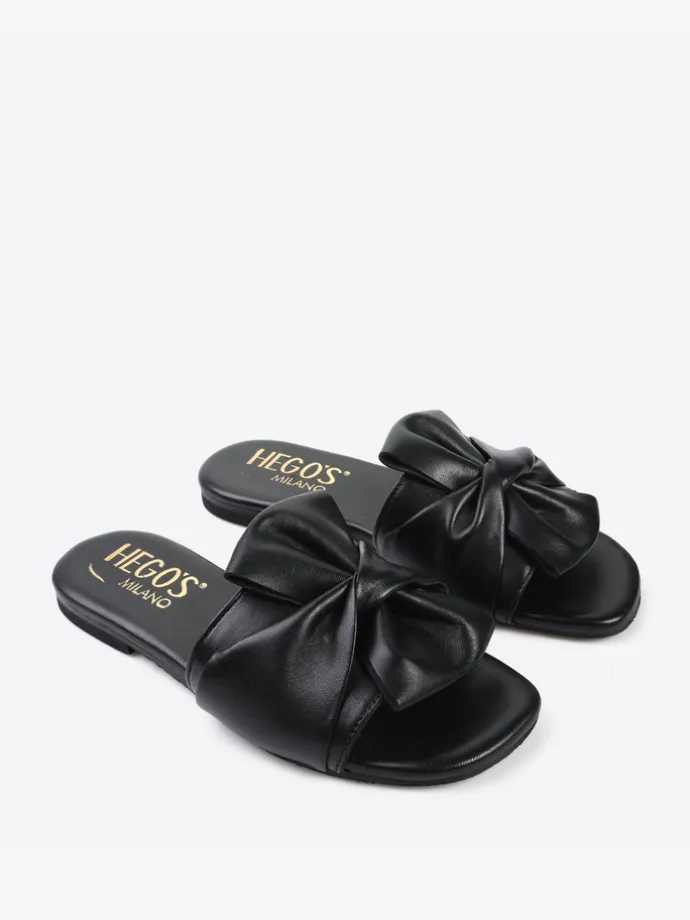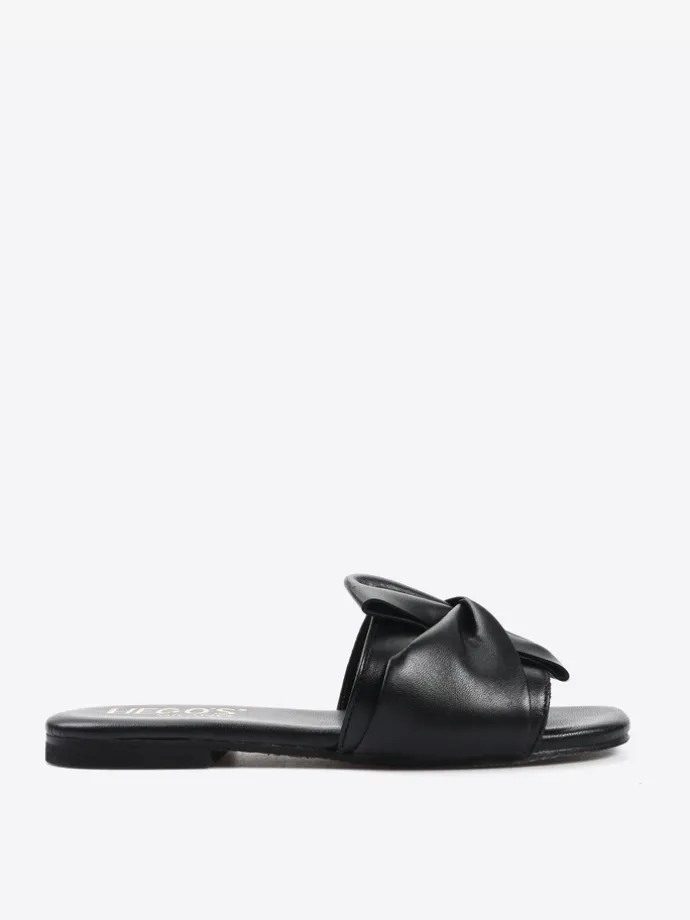 Klapki z ozdobnym wiązaniem wykonane z miękkiej, delikatnej skóry.