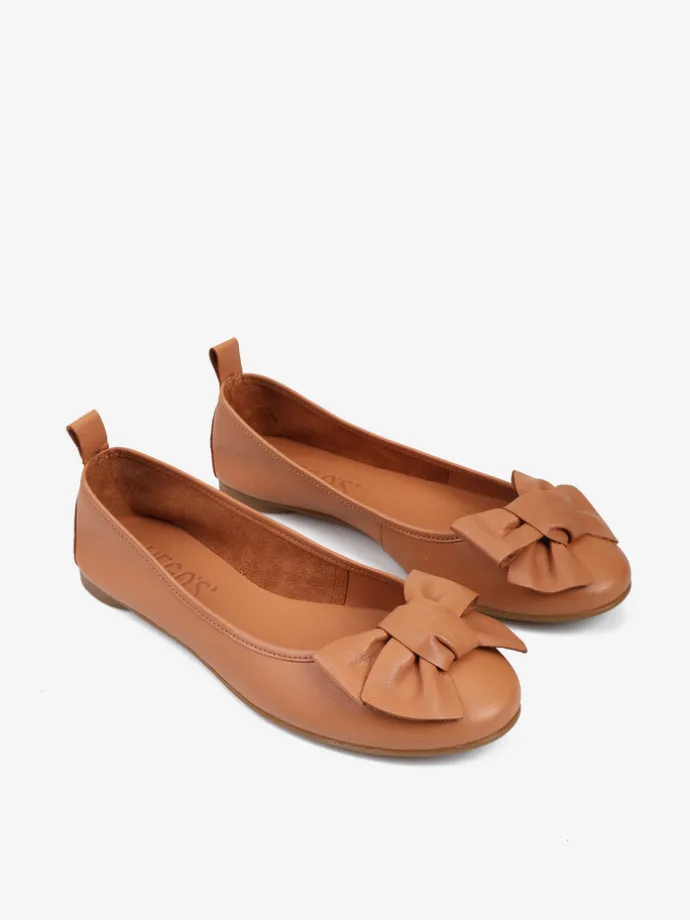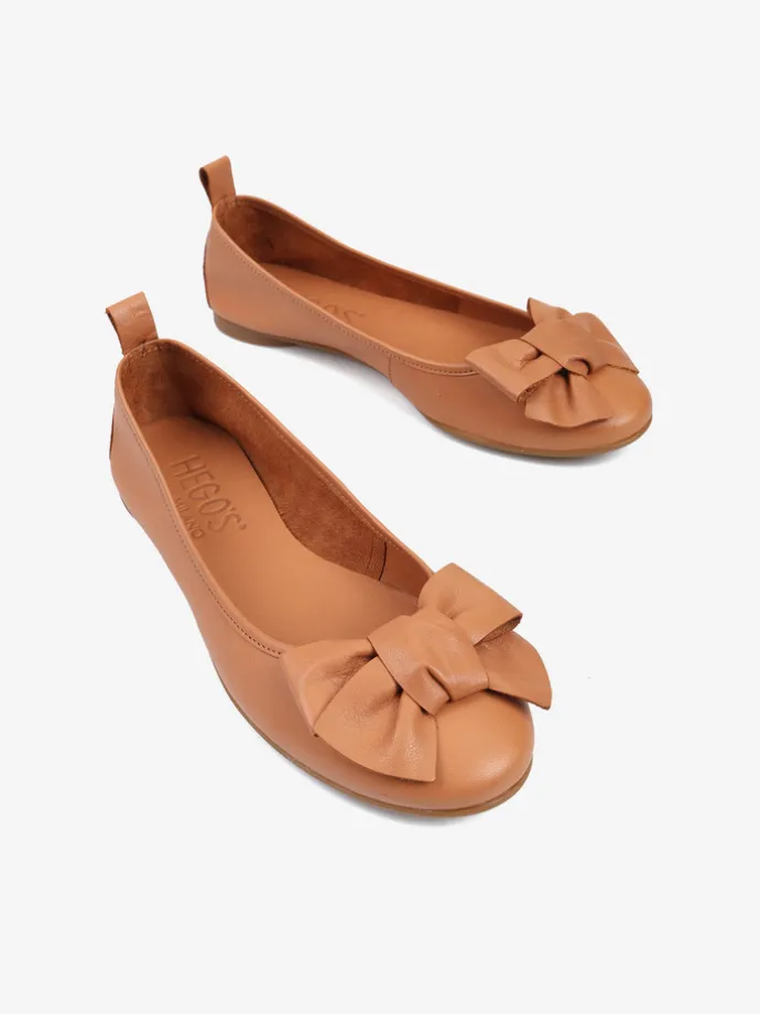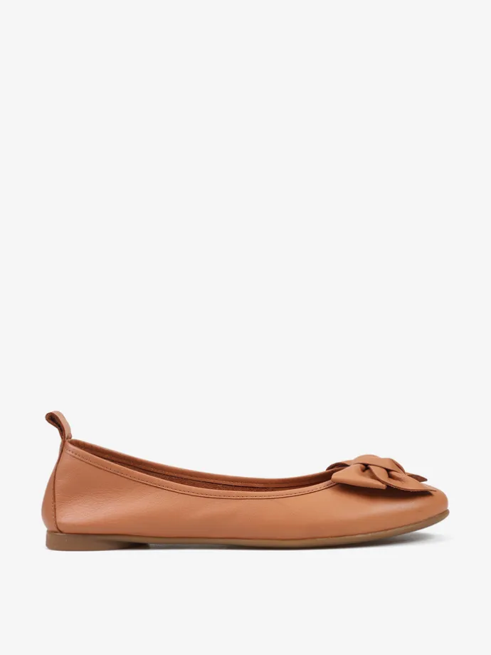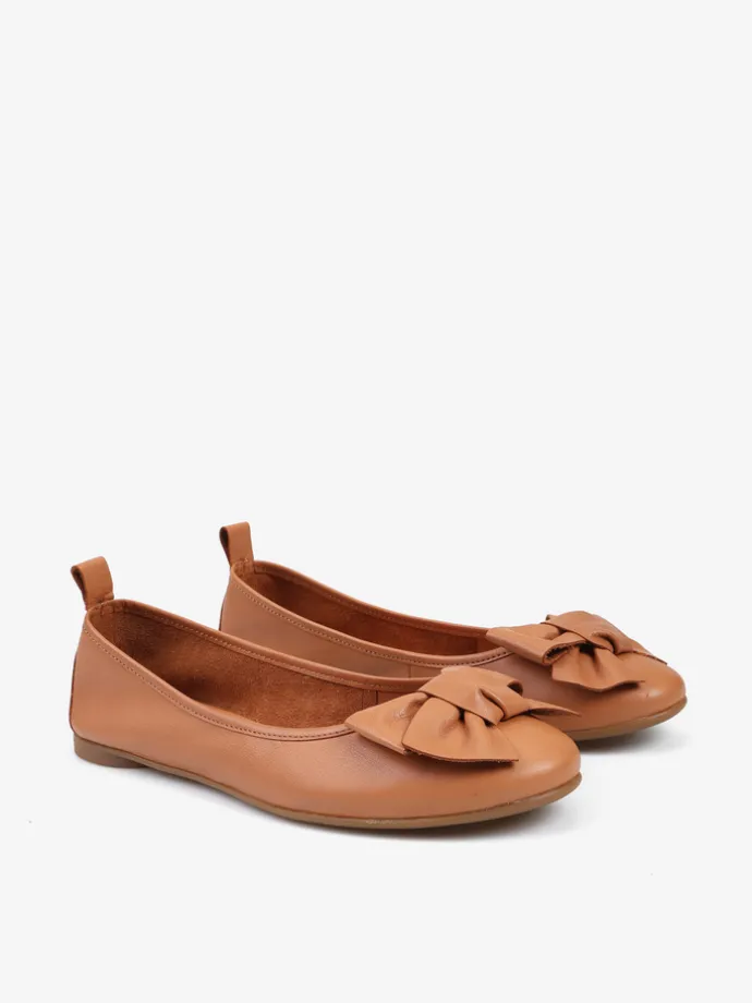 Baleriny wykonane z delikatnej, miękkiej skóry. Okrągły nosek ze skórzaną kokarda.