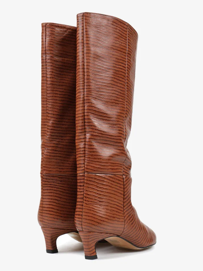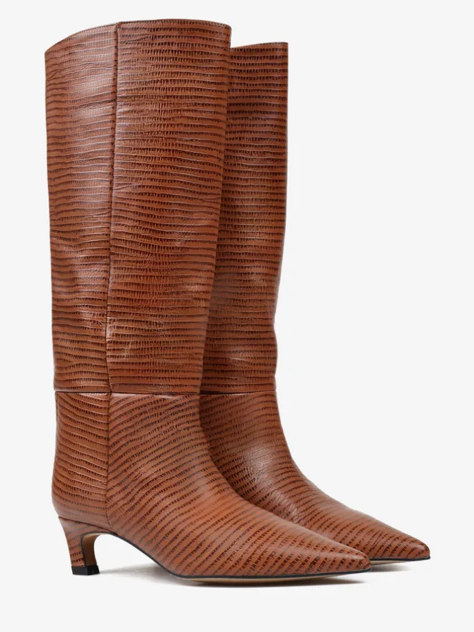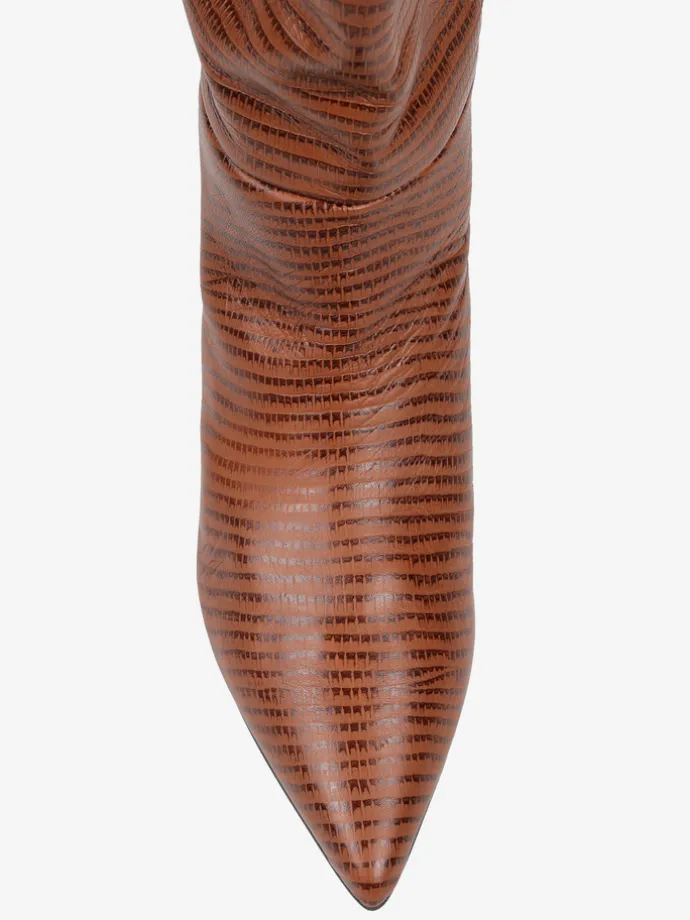 Kozaki na szpilce wykonane z rudej skóry tłoczonej w wężowy wzór. Rozszerzana cholewka i noski w szpic.