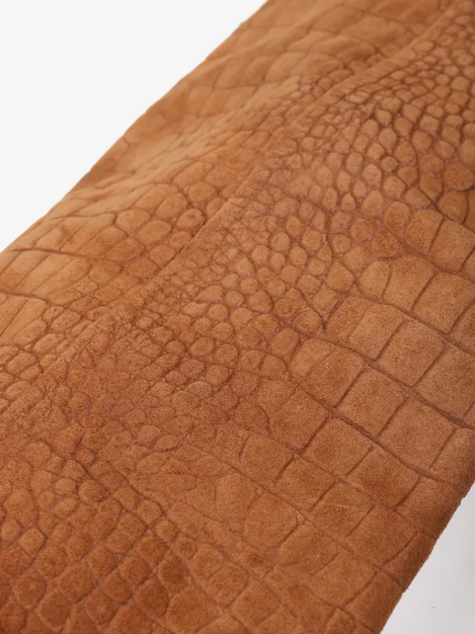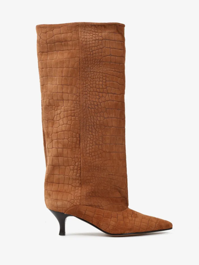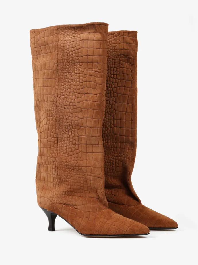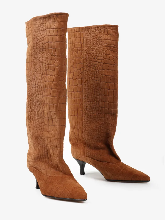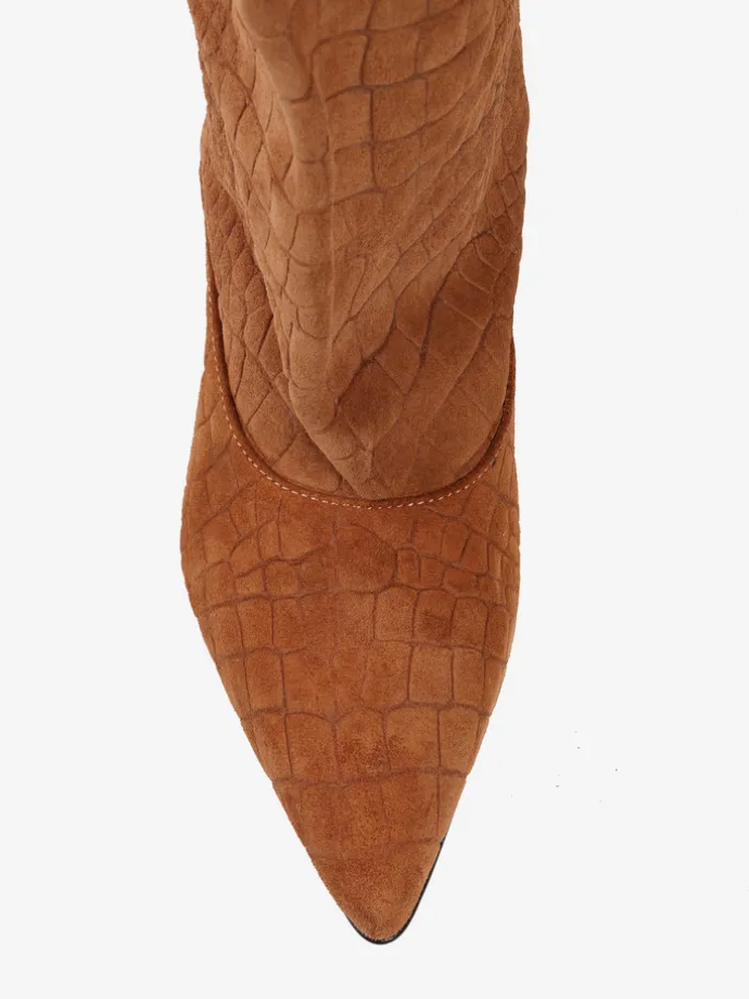 Kozaki na szpilce wykonane z zamszu tłoczonego w krokodyli wzór. Szeroka cholewka i noski w szpic.