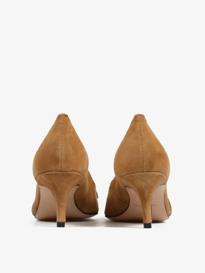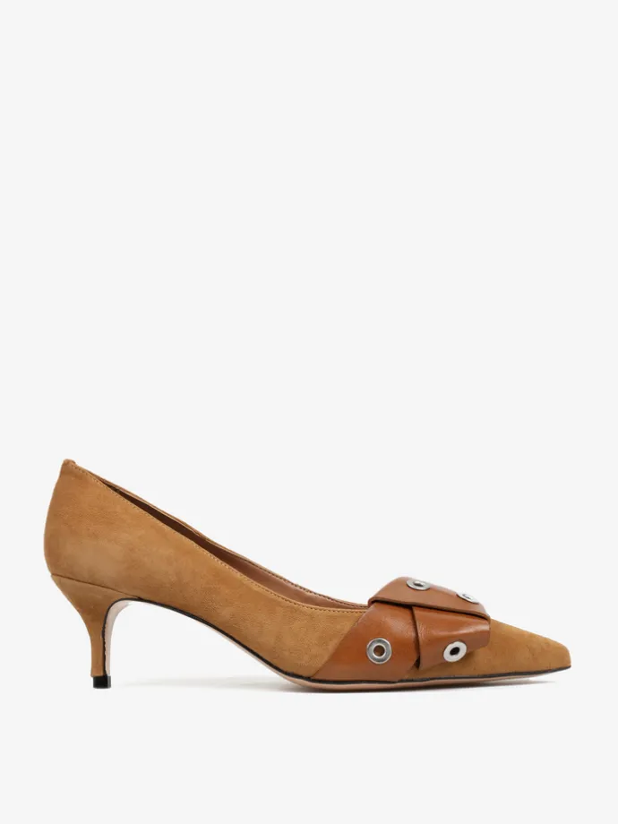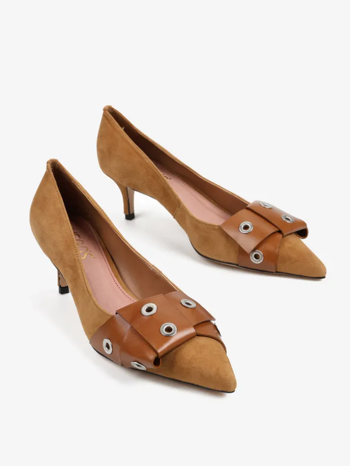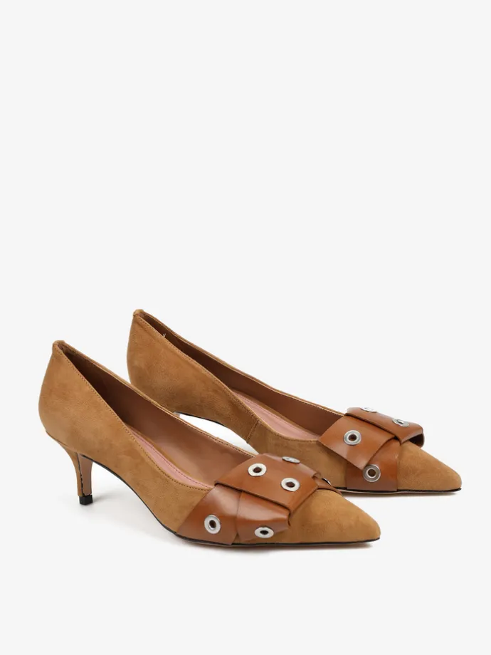 Zamszowe szpilki z noskiem w szpic i skórzaną aplikacją z ćwiekami.