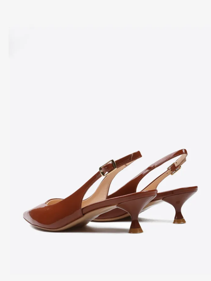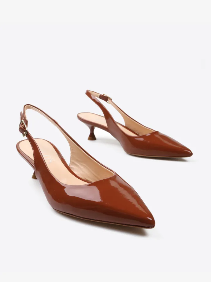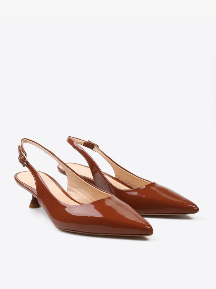 Lakierowane, klasyczne szpilki z noskiem w szpic. Odkryta pięta z regulowanym paskiem.