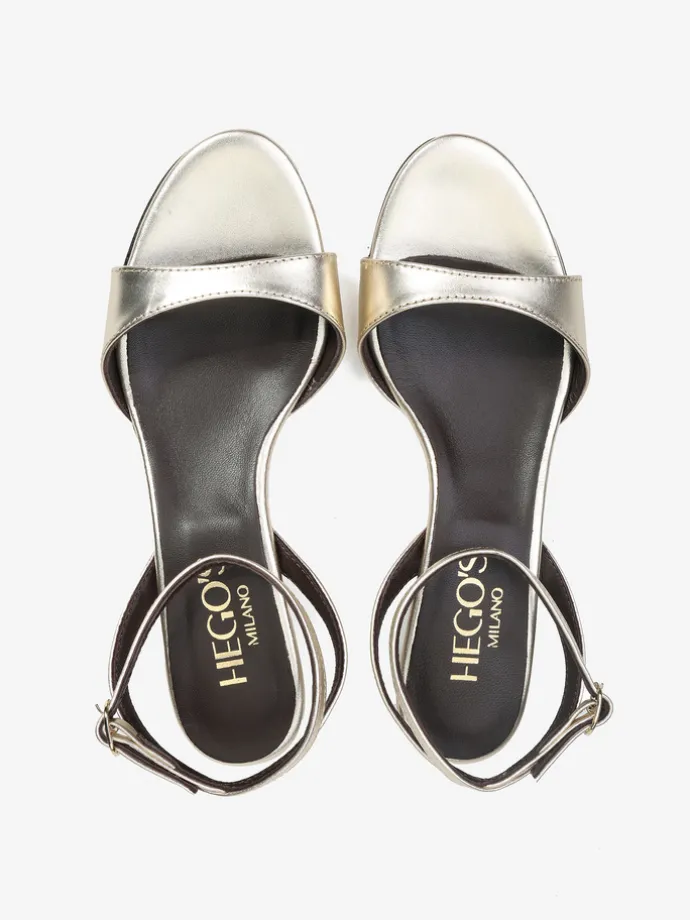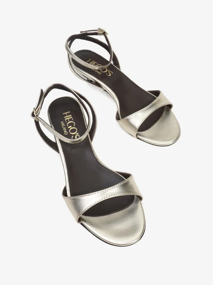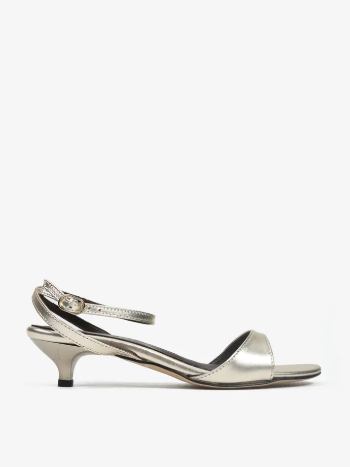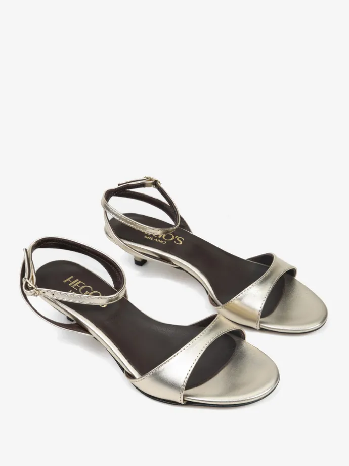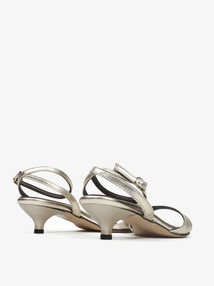 Subtelne sandały na niskiej szpilce wykonane z metalizowanej skóry. Regulowane zapięcie na kostce.