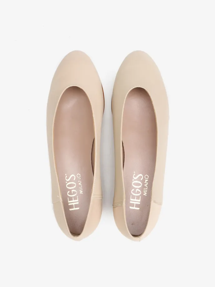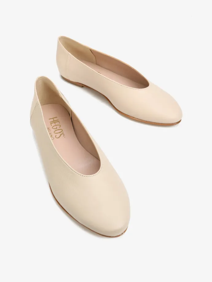 Proste baleriny z owalnym wycięciem i zabudowanymi brzegami na skórzanej podeszwie, wykonane z delikatnej, miękkiej skóry.