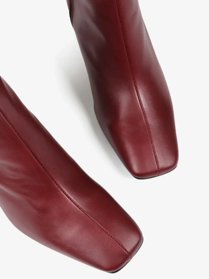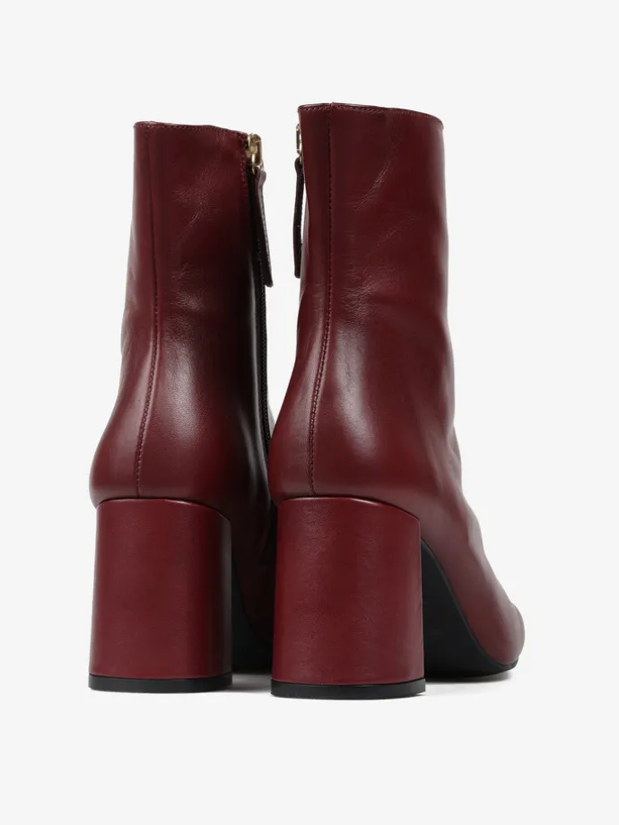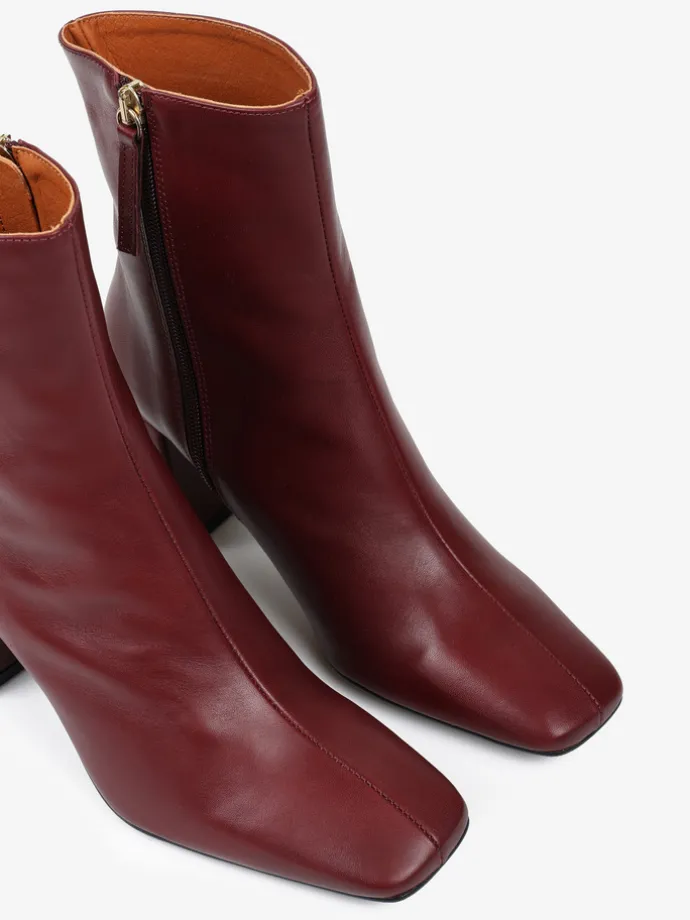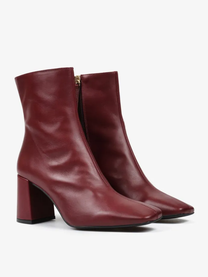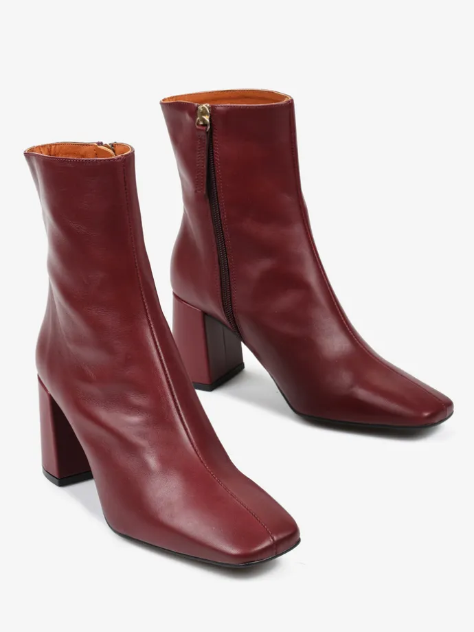 Bordowe botki na rozszerzanym słupku. Kwadratowe noski i zapięcie na suwak.