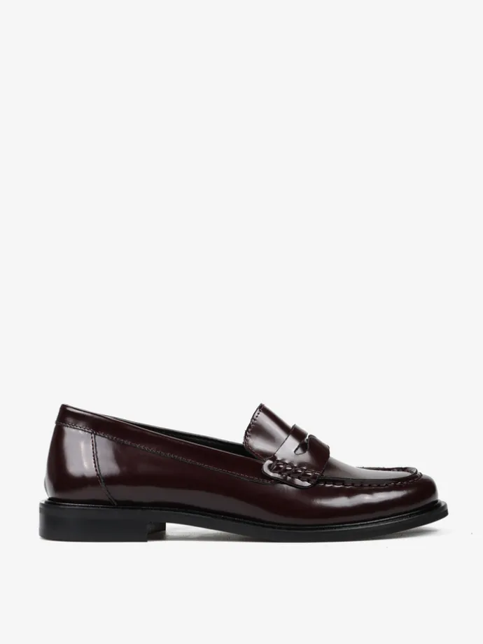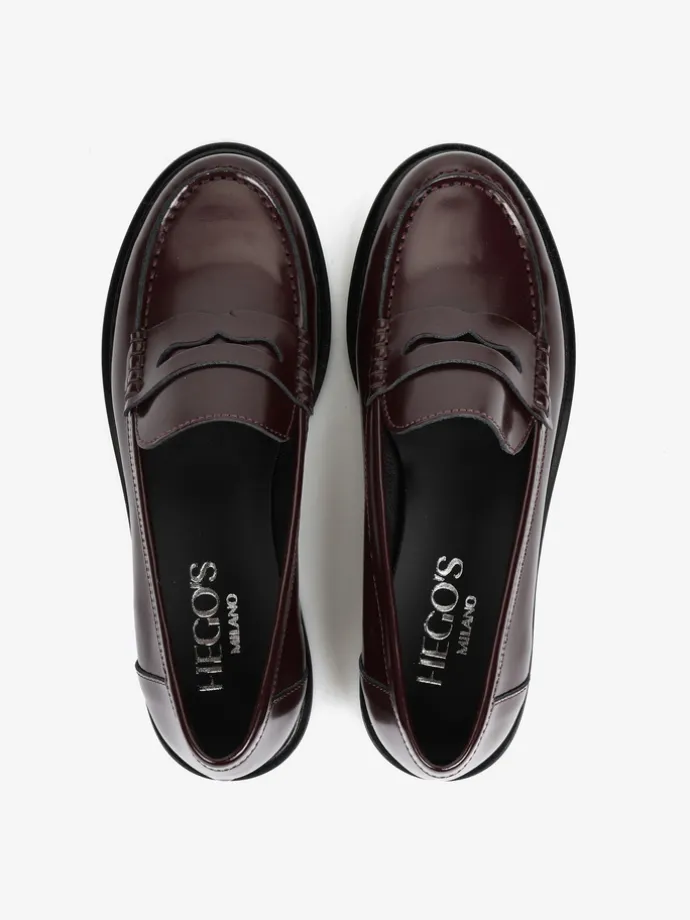 Klasyczne mokasyny college z ozdobną patką i wysokim językiem. Wykonane z bordowej skóry wysoko polerowanej.