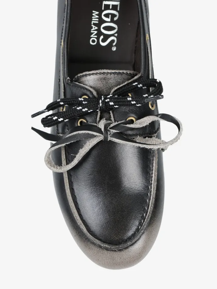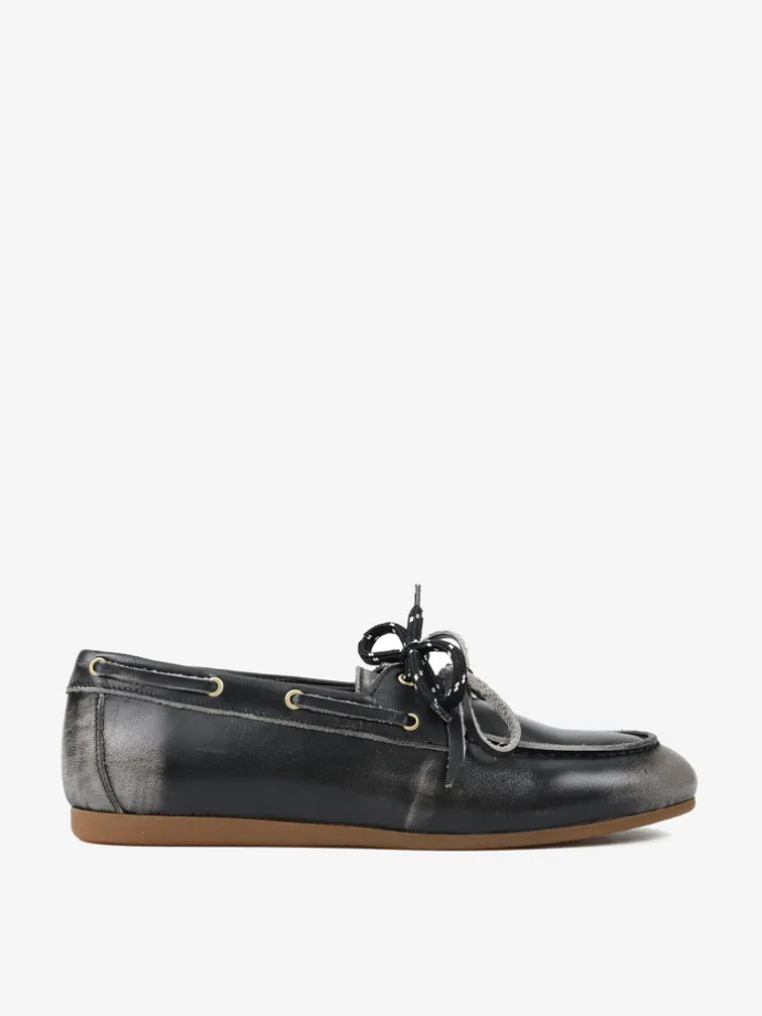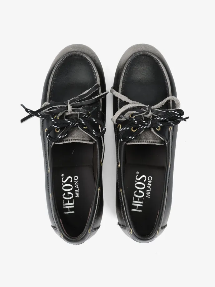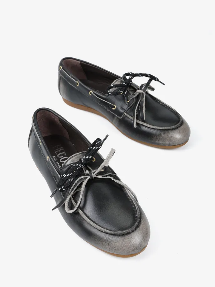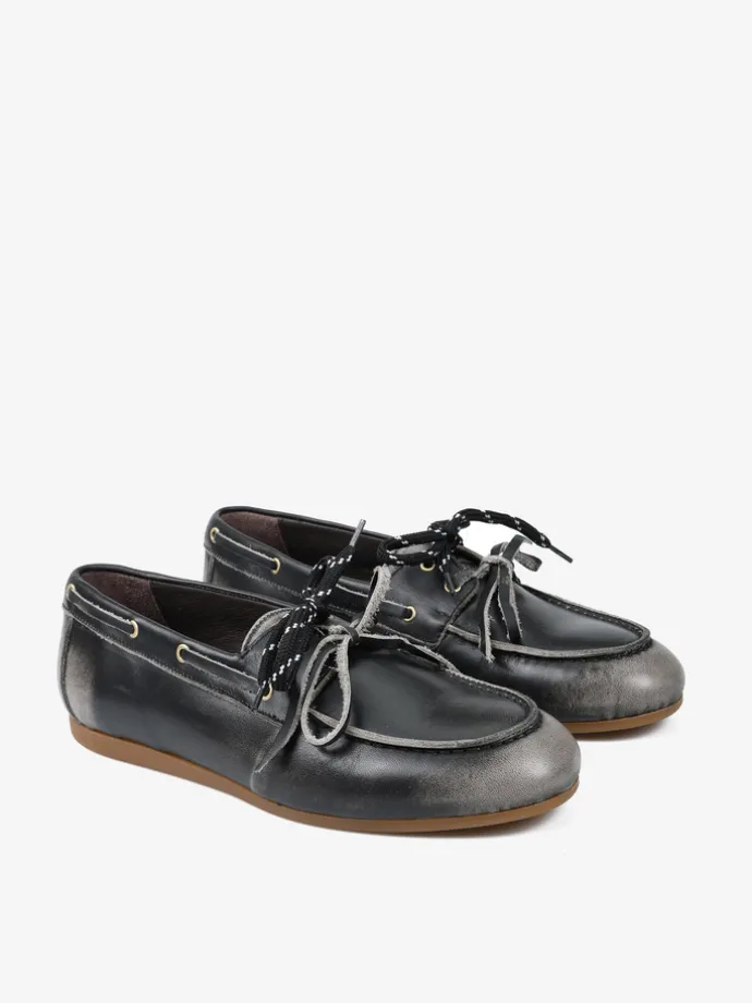 Mokasyny wykonane ze skóry z efektem sprania, z wiązaniem pozwalającym na idealne dopasowanie. Dodatkowa para czarnych sznurowadeł.
