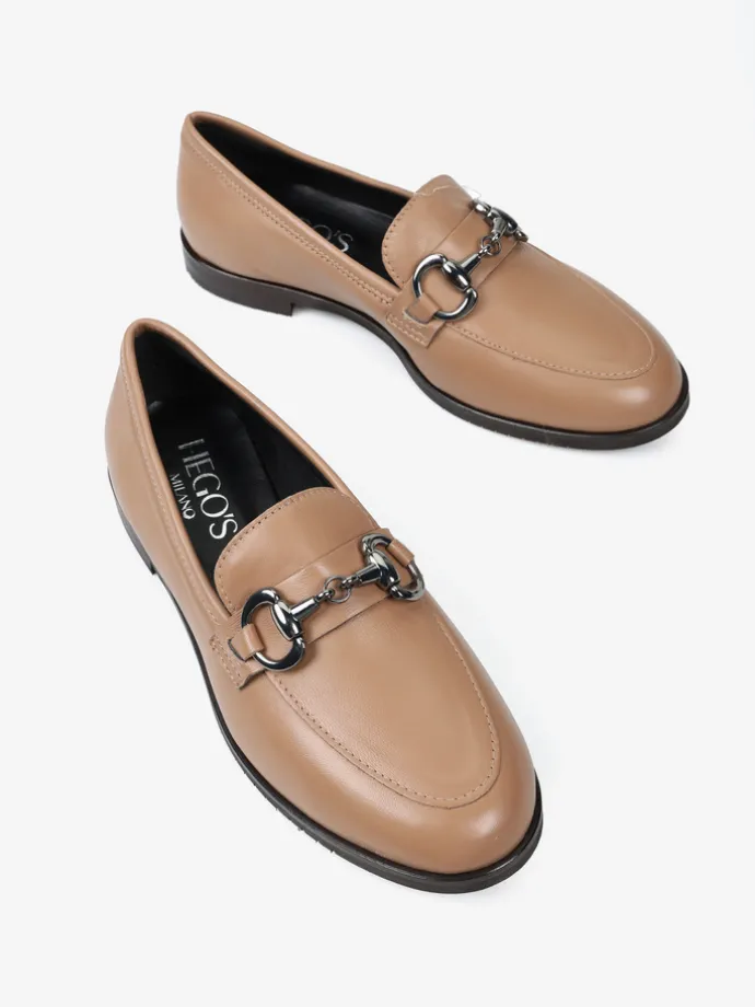 Mokasyny na płaskim obcasie wykonane są z włoskiej skóry naturalnej. Cholewka w kolorze taupe ozdobiona została wędzidłem. Wykonane z miękkiej i delikatnej skóry.