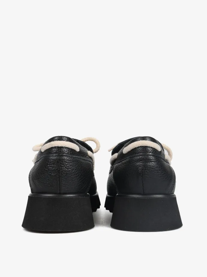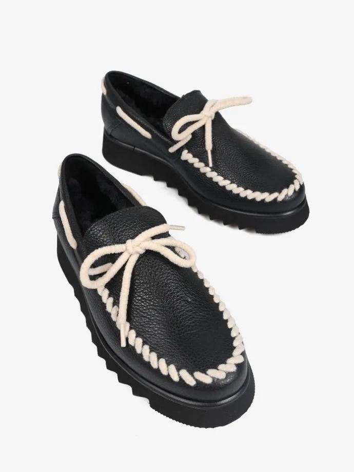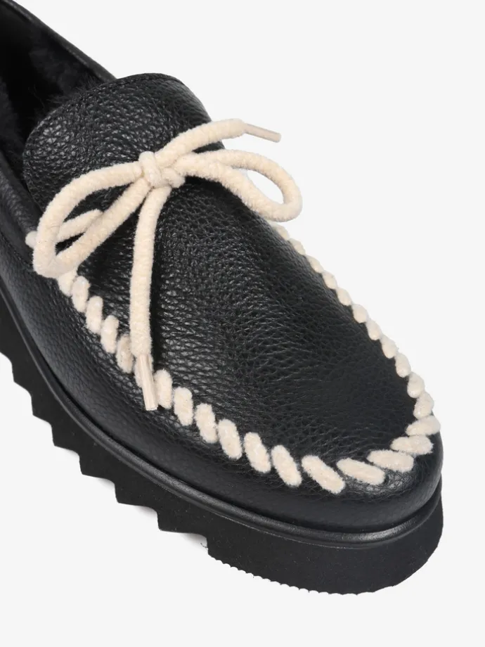 Skórzane mokasyny na efektownej podeszwie z wnętrzem wyłożonym miękkim, sztucznym futrem. Wiązanie z kremowego sznurka pozwala na idealne dopasowanie.