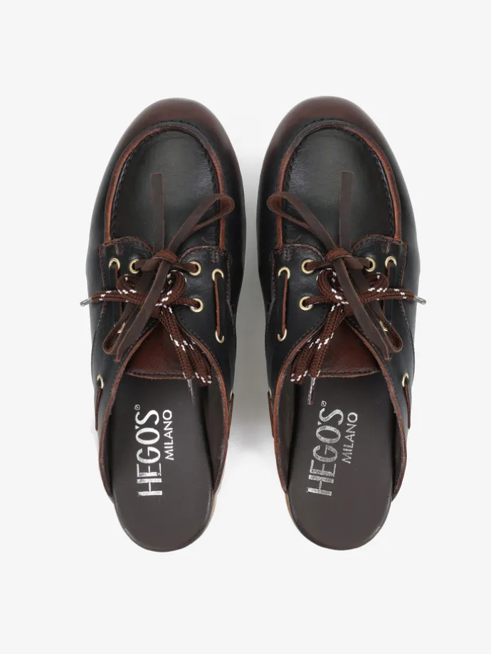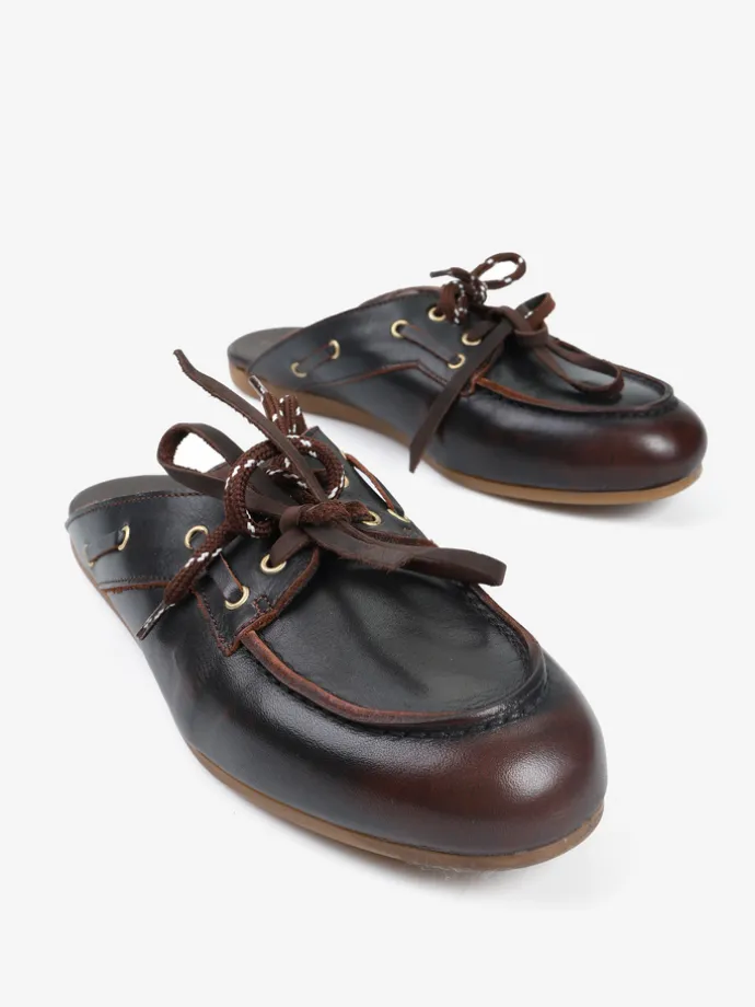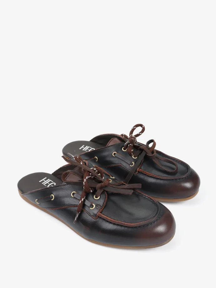 Skórzane mule z wiązaniem pozwalającym na idealne dopasowanie. Dodatkowe sznurowadła w brązowym kolorze.