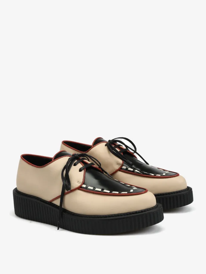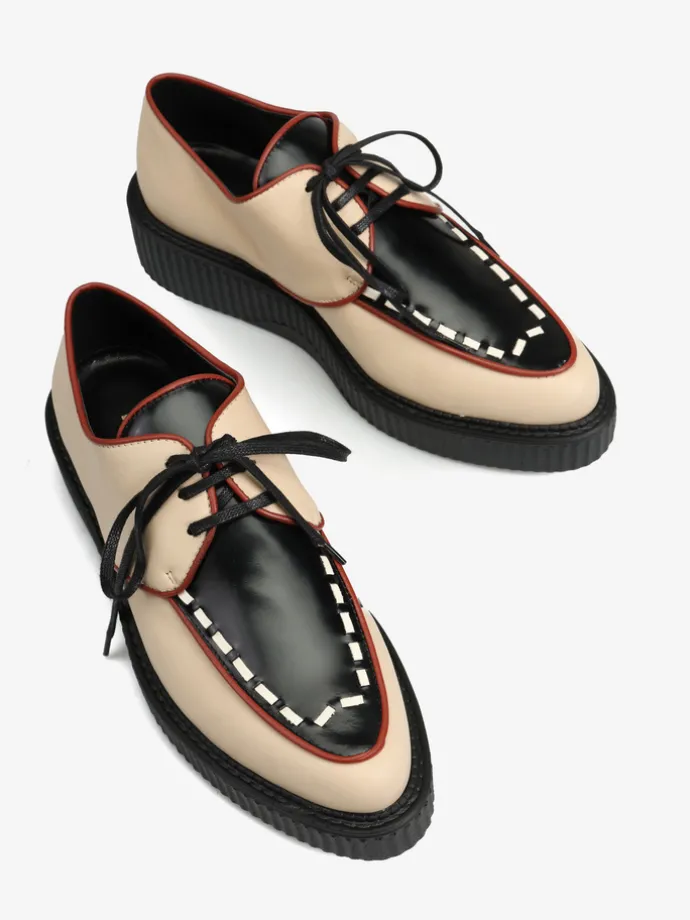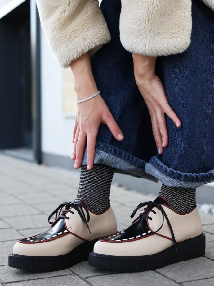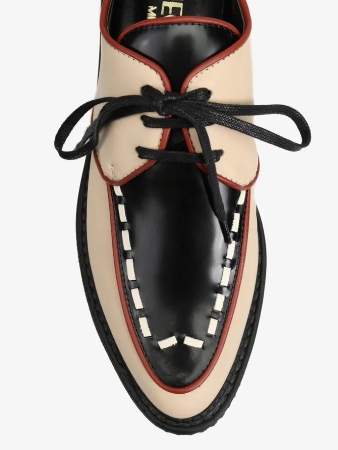 Wiązane półbuty na platformie, wykonane z miękkiej i delikatnej skóry. Kontrastujący język z ozdobnym, grubym szwem.