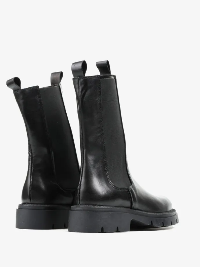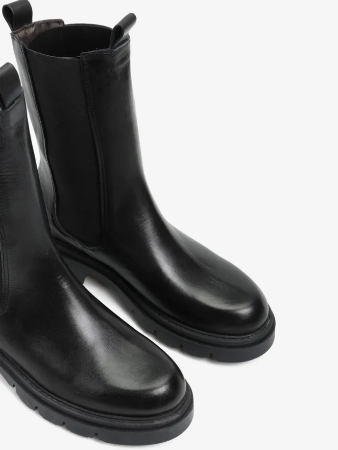 Skórzane sztyblety na grubszej podeszwie. Wysoka cholewa i okrągły nosek.